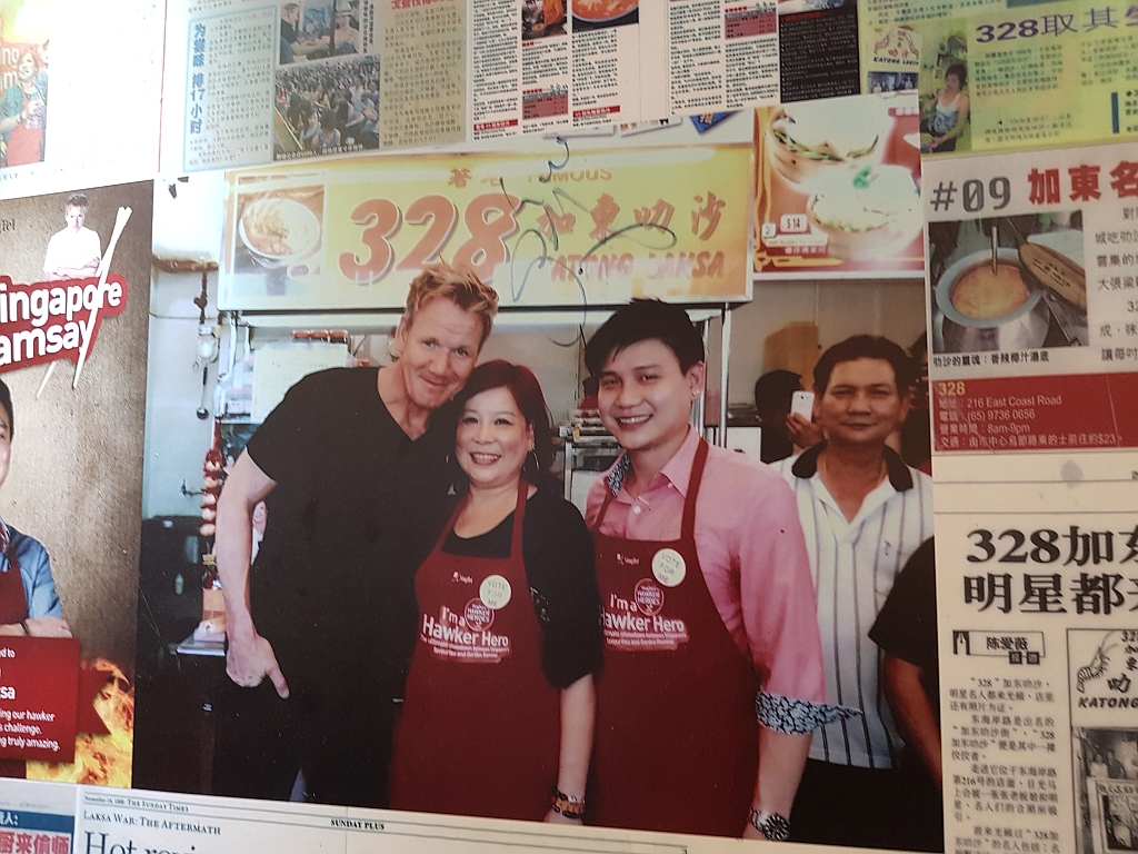 Vor einigen Jahren gab es mal einen Wettbewerb mit dem britischen Koch Gordon Ramsey, der die drei Nationalgerichte (Chili Crab ist das dritte) nachkochen musste. Er hat nur bei der Krabbe die Jury überzeugen können, bei den beiden anderen hat jeweils der lokale Koch gewonnen. Und bei dem Katong Laksa war das eben der Inhaber dieses Restaurants.