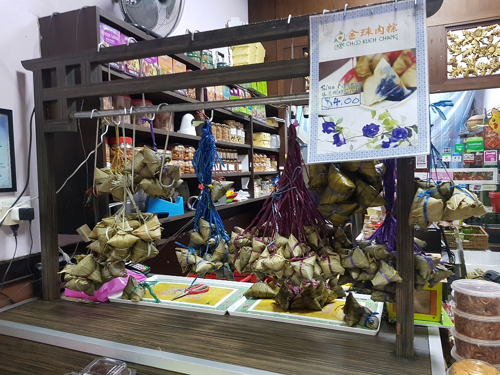 Dort gab es eine kleine, in Teeblättern eingepackte, Klebreis-Schwein-Speise, auch wieder traditionelle Peranakan-Küche. Der Laden, in dem diese hier verkauft werden, beinhaltet auch ein Museum über die Peranakan-Kultur und versucht selbige am Leben zu erhalten.