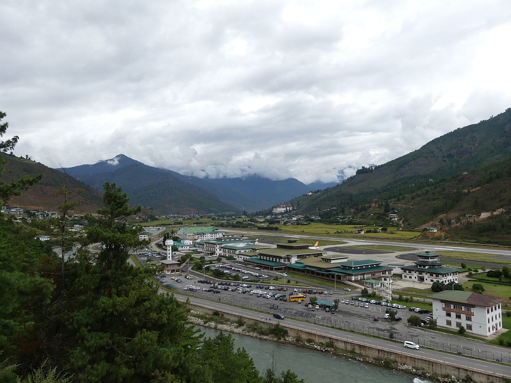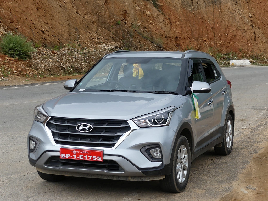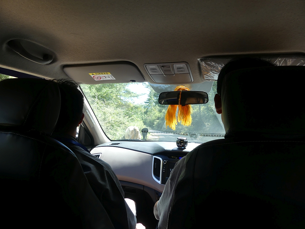 Norbu, unser Guide für die Tour, kam dann auch angeprescht, entschuldigte sich mehrfach und half uns gleich ins Auto. Bzw. versuchte unsere Koffer darin unterzubringen, was gar nicht mal so einfach war. Aber es ging. Und dann ging es los nach Paro, wo wir Geld, eine SIM-Karte für unser WiFi-Egg und das Mittagessen besorgen wollten.