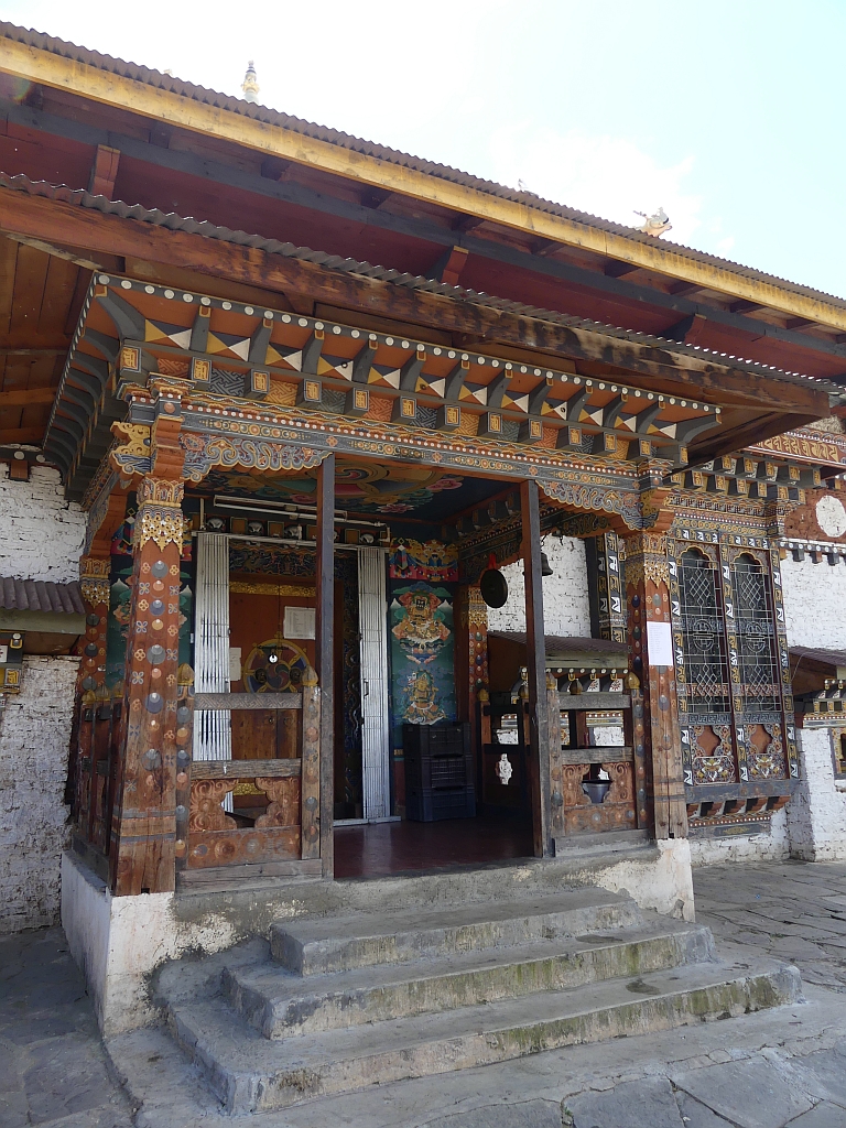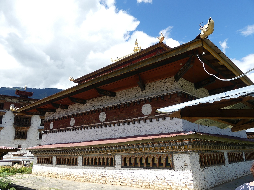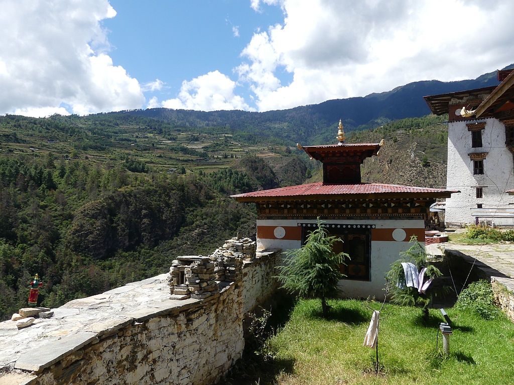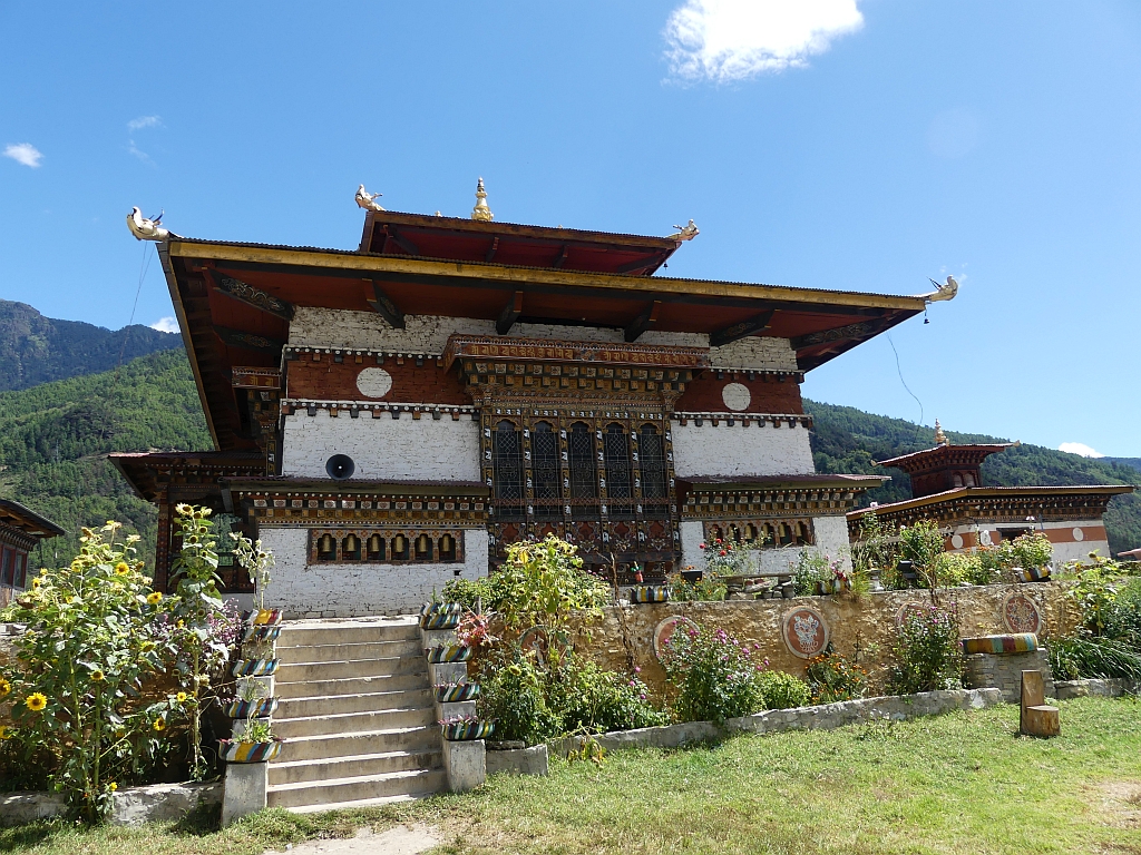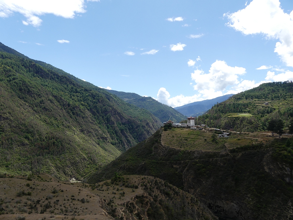 Unsere erste Fahrt führte von Paro in das westlich gelegene Haa-Tal. Da wir gerade erst gelandet waren, sind wir nicht die Route über den Pass gefahren, sondern haben diesen großräumig umfahren. Was zwei Folgen hatte: Die erste, eher angenehm, war unser erster Tempel für diesen Urlaub: Dem Dobji Dzong.