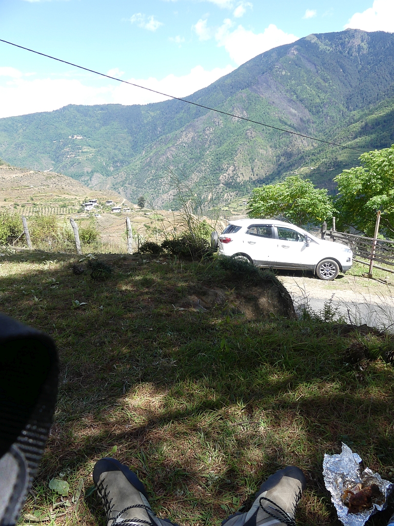 Da Norbu diese Tour häufiger macht, kannte er aber eine gute Ecke und so saßen wir unter Bäumen und aßen Sandwiches, Hühnchen, Eier und eine Banane. Sehr lecker übrigens!