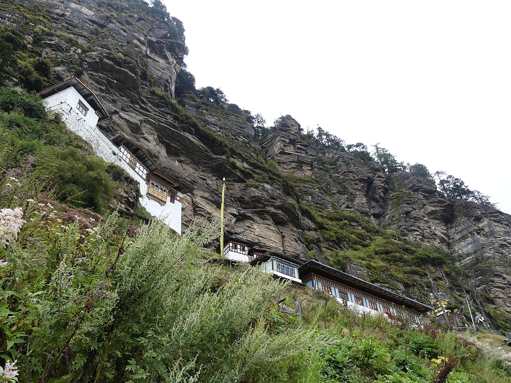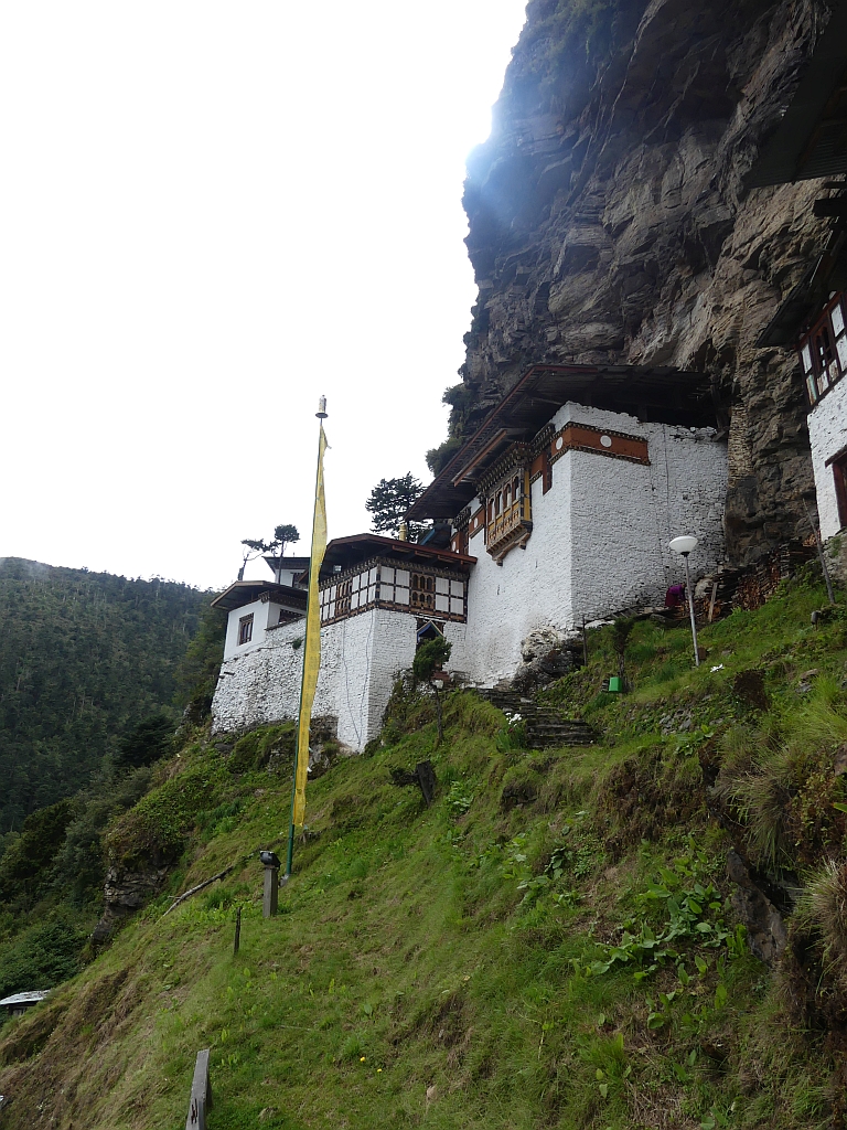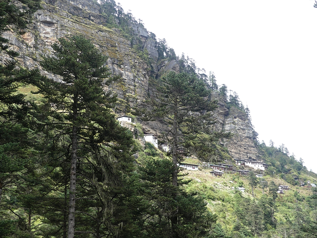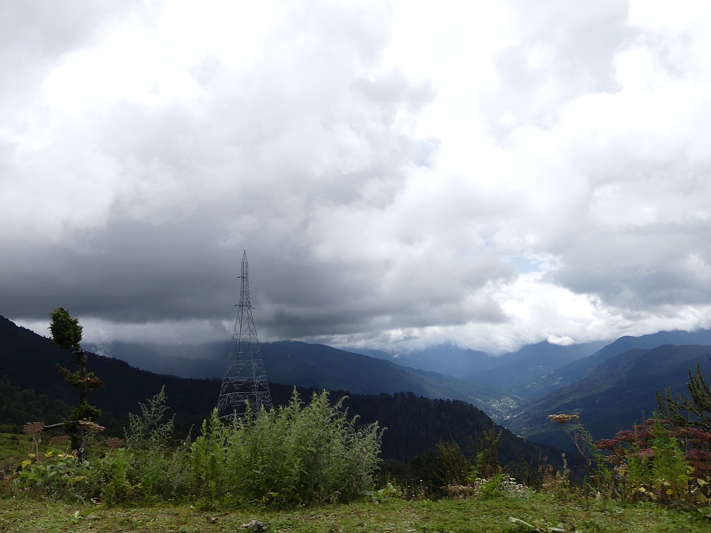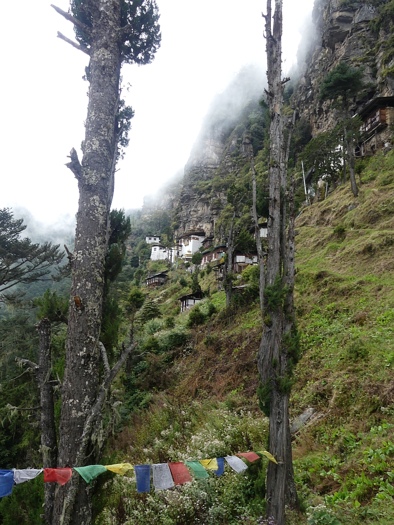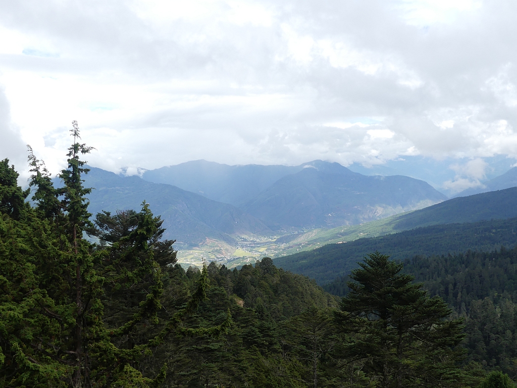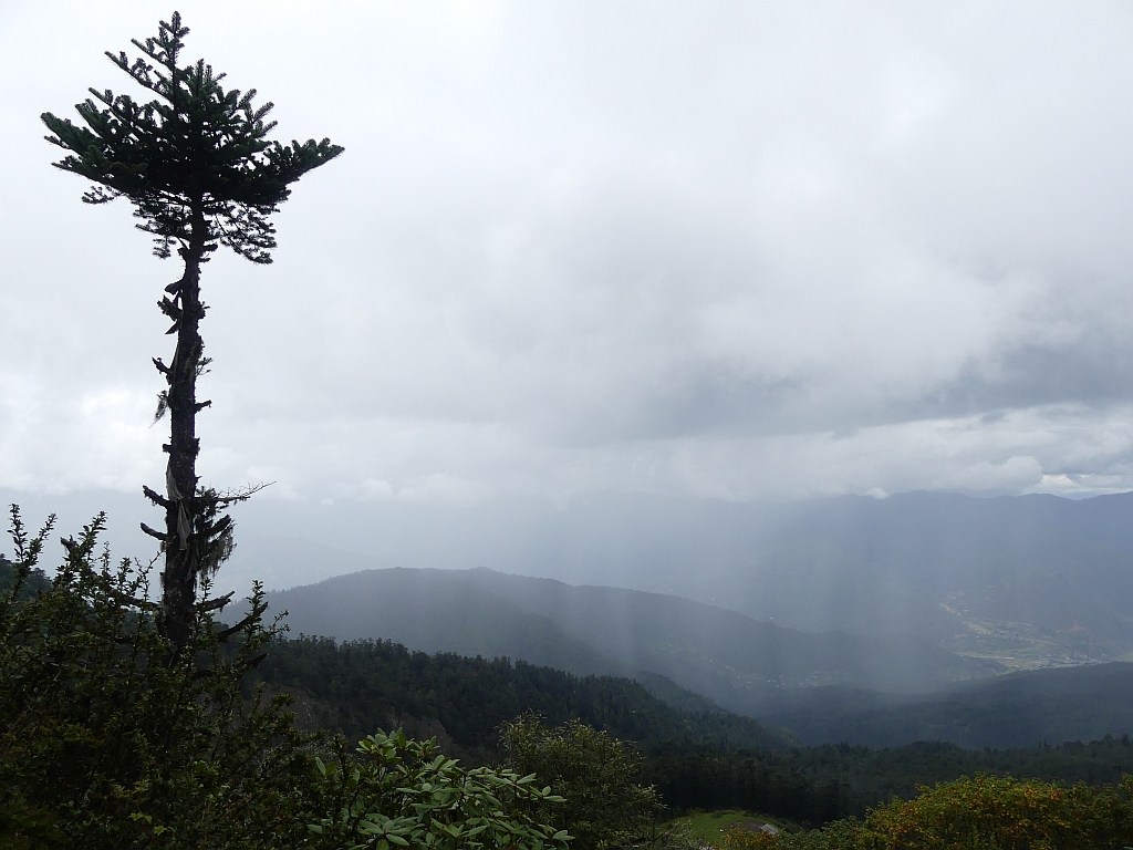 Trek bedeutet hier: Trampelpfad mit Steinen und Wurzeln. Teilweise recht rutschig, gerade weil es kurz vorher und zwischendurch immer wieder ein bisschen geregnet hat. Aber wir hatten ja keinen Zeitdruck, also ging es langsam und bedächtig den Berg hinab. Dabei konnte man am Anfang noch gut das Paro-Tal sehen sowie die langsam aufziehenden Regenwolken.