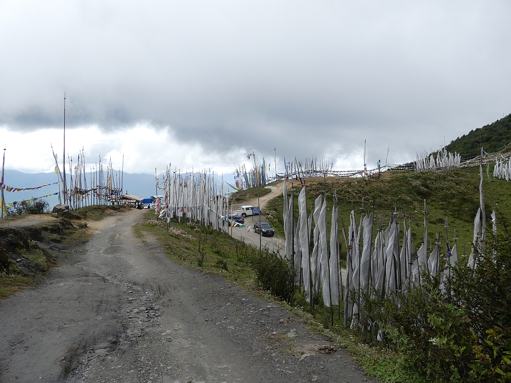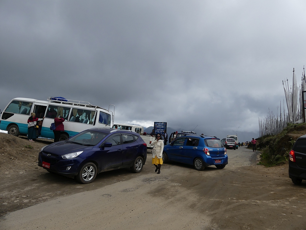 Nach etwa 90 Minuten sind wir dann oben auf dem Pass angekommen. Wie schon gesagt ist dies der höchste, mit dem Auto erreichbare Punkt in Bhutan. Dementsprechend fahren hier auch viele hin. Vor allem viele Busse. Meistens mit vielen Indern.