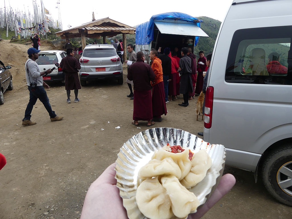 Also auf geht es: Etwa 100 Höhenmeter rauf und dann etwa 500 Höhenmeter hinab. Und das auf 6 Kilometern. Da braucht es vorher noch eine Stärkung laut unseres Fahrers, also hat er uns ein paar Dumplings mit Chilies gekauft.