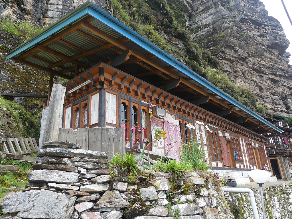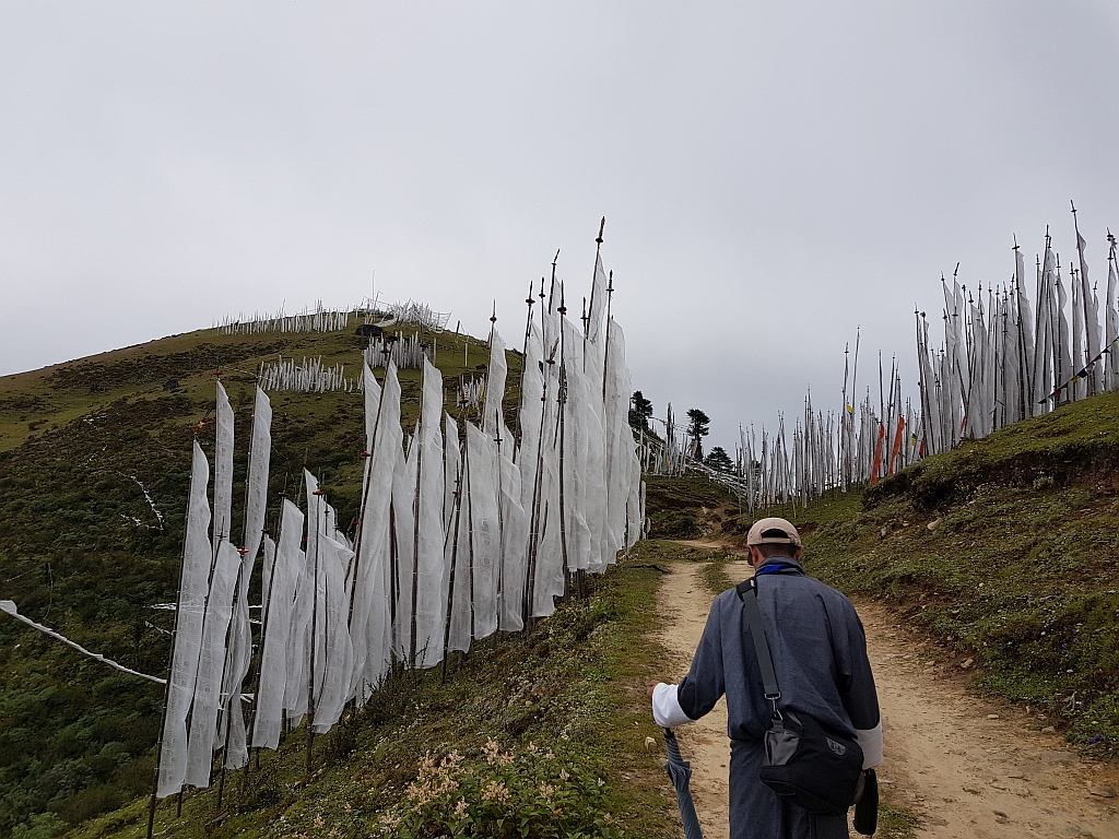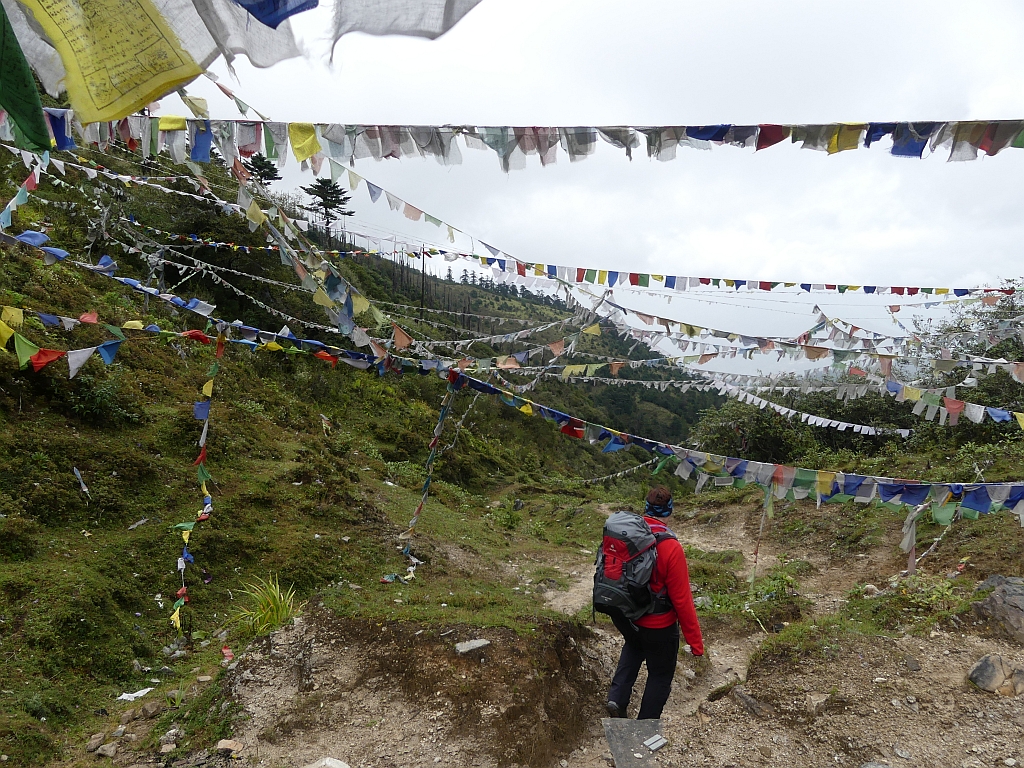 Als nächsten Programmpunkt hatten wir eine Wanderung vorgesehen, die uns zuerst noch ein paar Meter auf über 4000 Meter bringen soll und dann runter auf das auf 3600 Meter liegende Kila Nonnenkloster. Dieses Kloster wurde im 9. Jahrhundert gegründet und ist eines der ältesten in Bhutan. So um die 50 Nonnen im Alter von 17 bis 65 Jahren leben und beten hier. Und es ist schwer erreichbar, da man entweder eben vom Pass herab gehen muss oder über eine Schotterpiste hinauf fahren muss. Und selbst dann muss man noch 15 Minuten gehen.