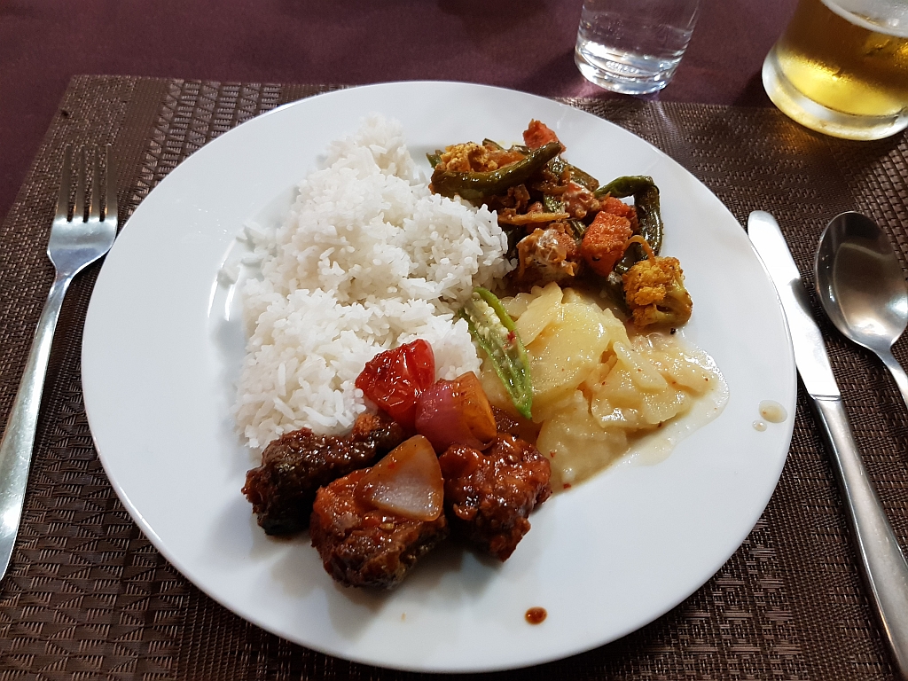 Etwas in die Jahre gekommen, aber ausreichend. Im TV gab es dann indisches Sportfernsehen und zum Abendessen ein indisches Buffet. Passte auch zu der großen Gruppe von Indern, die auch im Hotel war – uns war das zu laut. Also die Gruppe, nicht das Essen – das war ok.