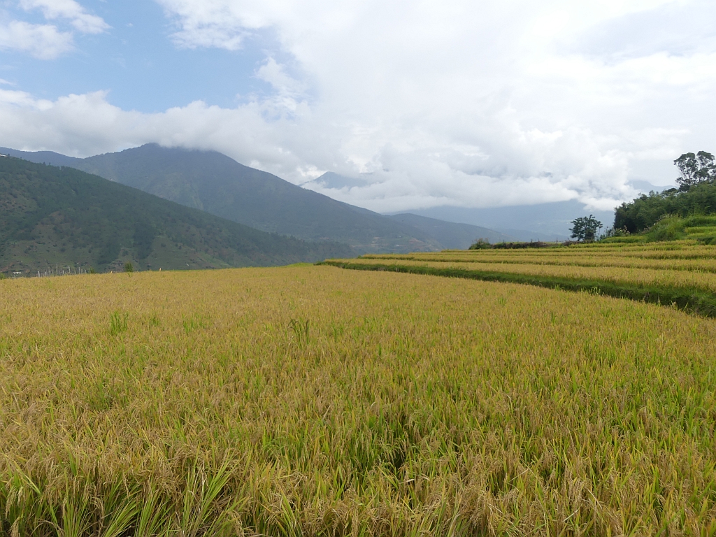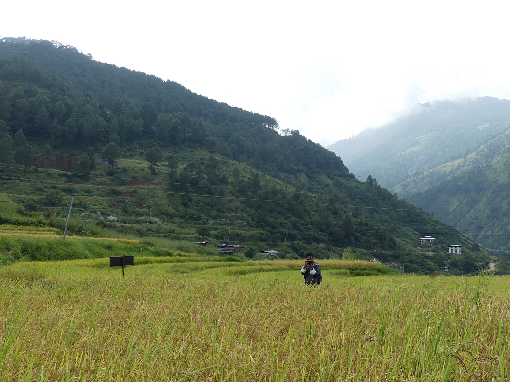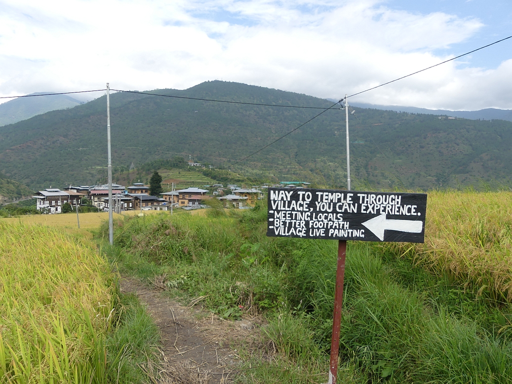 An dieser Stelle, wo heute das Chimi Lhakhang steht, hat er ebenfalls einen Dämon vertrieben, indem er ihn einsperrte. Und hierzu wurde der Tempel errichtet, zu dem wir ein Stück durch die Reisfelder und ein kleines Dorf wandern wollten.