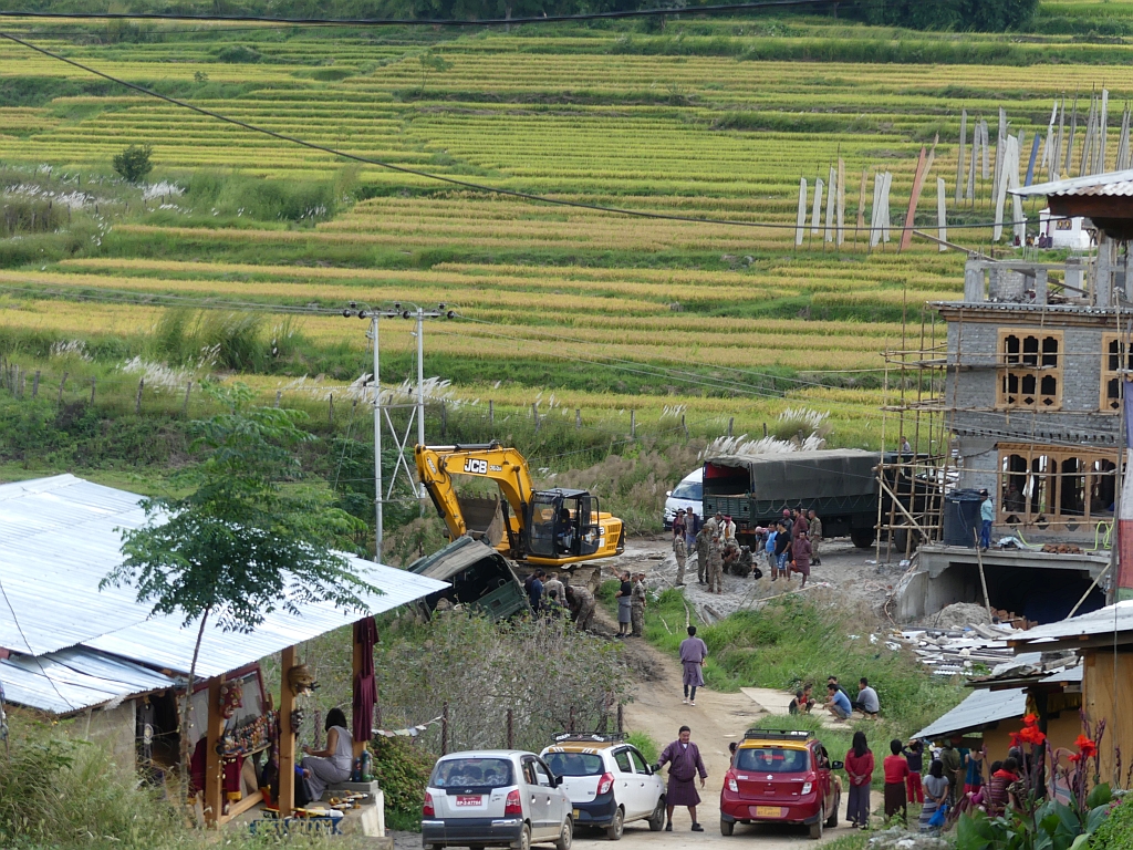 Diese Stelle sollte dann sehr interessant werden. Kurz nach diesem Foto kamen uns zwei LKWs der bhutanesischen Armee entgegen. Vorne zwei Fahrer, hinten drauf mehrere junge Soldaten. Als einer aus dem zweiten LKW uns gewunken hat, haben wir zurückgewunken. Wir vermuten, dass dies dann allerdings eventuell den Fahrer abgelenkt hat. Weswegen dieser den LKW mitsamt Besatzung in den Graben gesteuert hat. Einer ist runtergefallen und der Rest ist dann schnell abgesprungen. Keine Verletzten, nur viele verdutzte Gesichter bei den Soldaten, den anderen Leuten, den Indern auf der Baustelle nebenan und bei uns. Wir haben uns dann erst einmal zu Tempel verdrückt.