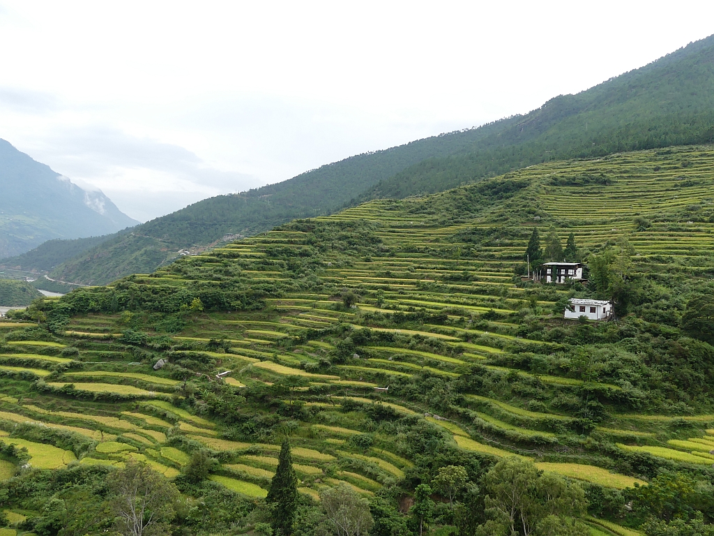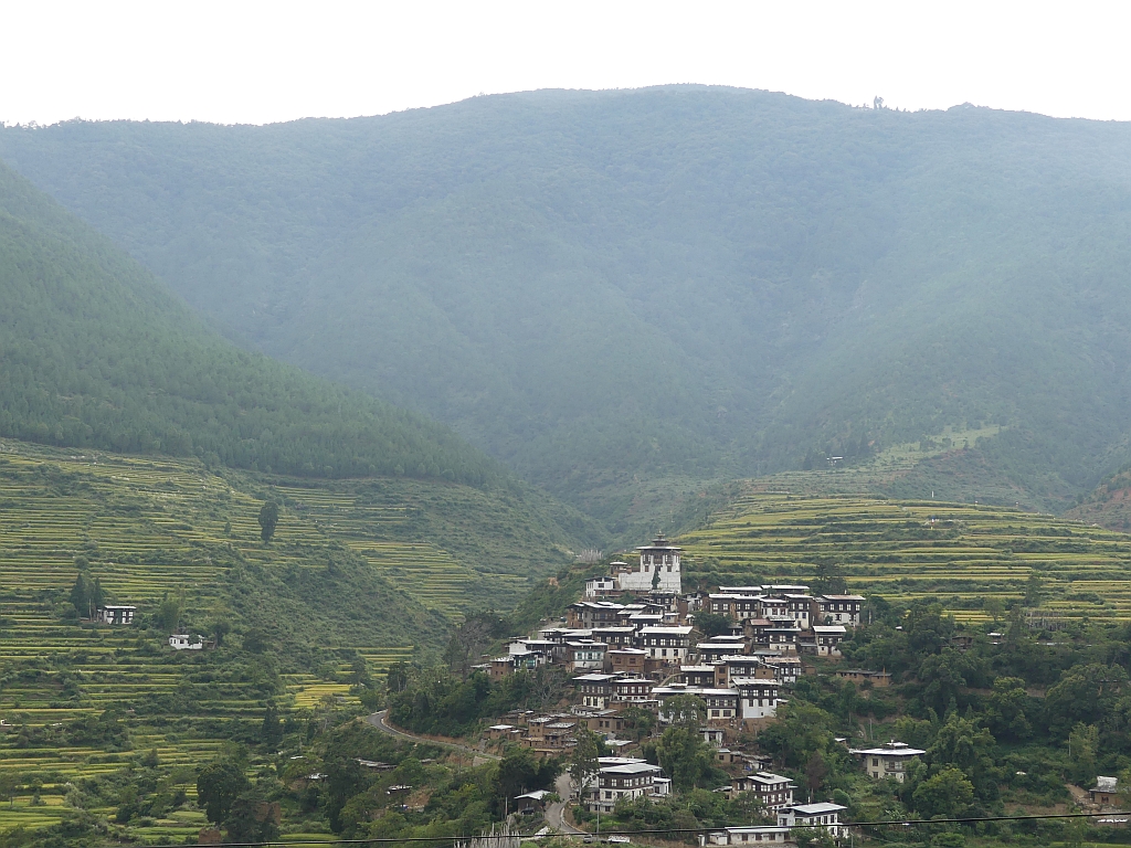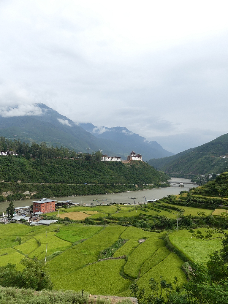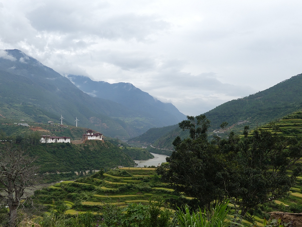 Sehr sinnbildlich für Bhutan: Die Reisterrassen, das Dzong (was gerade wieder aufgebaut wird) und die ersten beiden Windkraftwerke Bhutans, die hier aufgestellt wurden und die Gemeinde mit Strom versorgen.