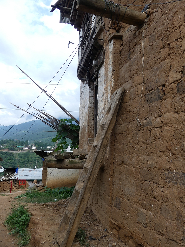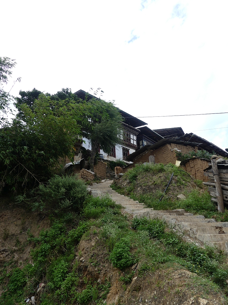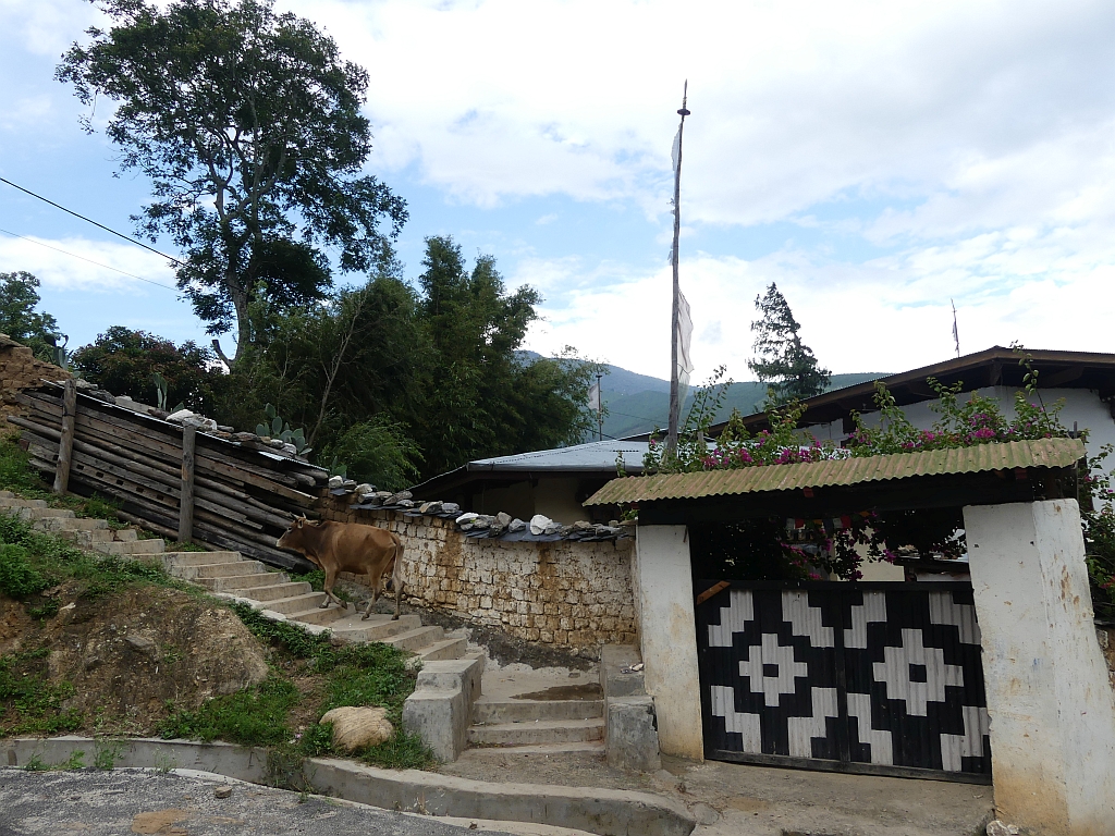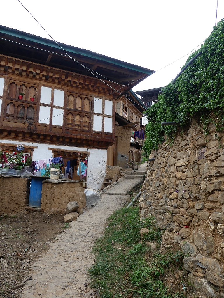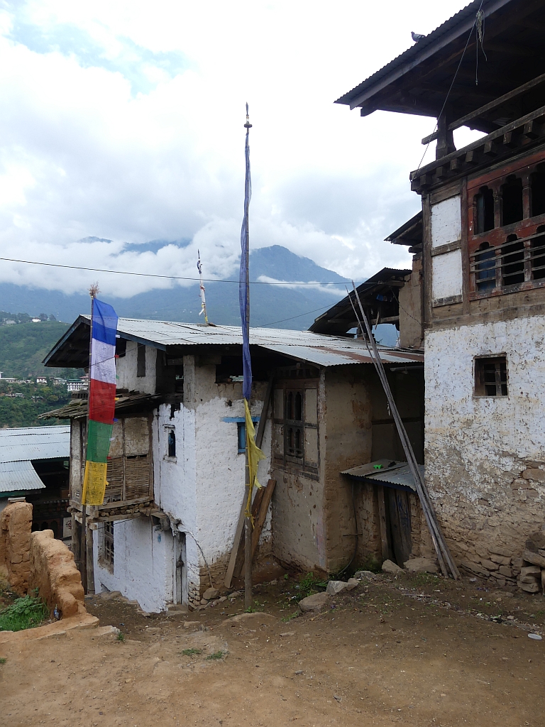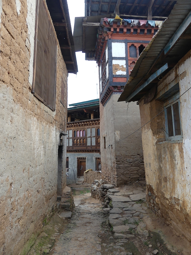 Dann hat sie uns aber unserem Schicksal überlassen. Im Dorf selber sieht es noch so aus, wie es vor 30-40 Jahren mehr oder wenig überall in Bhutan außerhalb der größeren Städte ausgesehen haben muss. Sehr viele alte Häuser, viel künstlerisches (aber eben schon verfallen bzw. nicht gepflegt) und irgendwie etwas schmuddelig. Und viele Menschen, die einen anschauen.