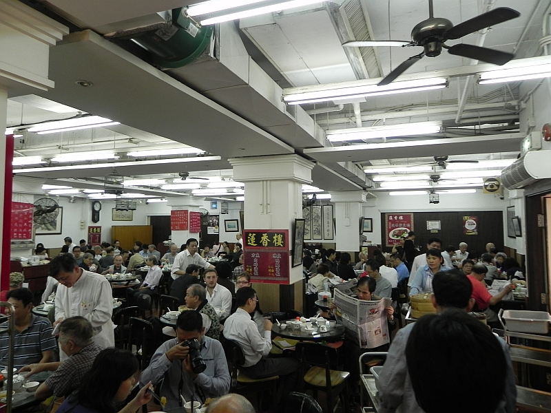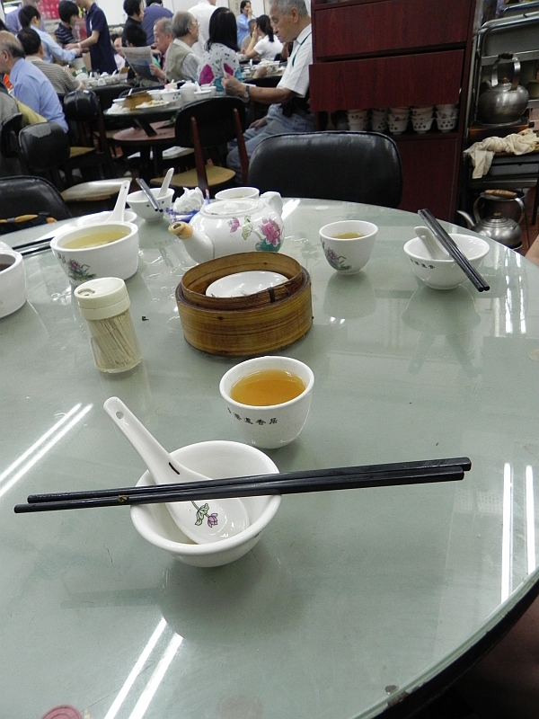 Weiter ging es zu einem traditionellen Dim Sum Restaurant. Und das war wirklich beeindruckend, denn davon gibt es nur noch zwei Stück in Hong Kong. Wir waren im Lin Heung Tea House. Das ganze läuft folgendermaßen ab: Man setzt sich an einen freien Tisch und bekommt Tee, Schälchen und Essstäbchen. Mit dem heißen Tee desinfiziert man dann selber das Besteck. Wir bekamen dann auch noch die Warnung nix zu essen, was auf dem Tisch liegt!