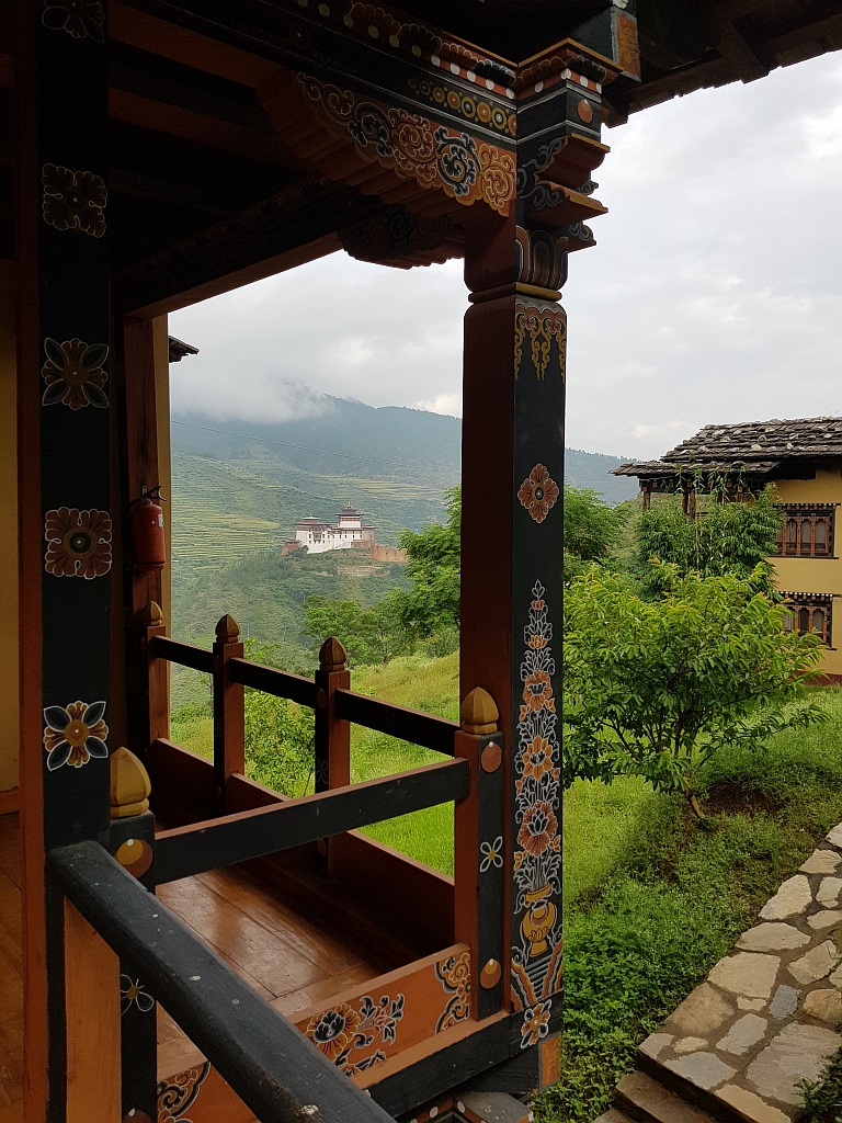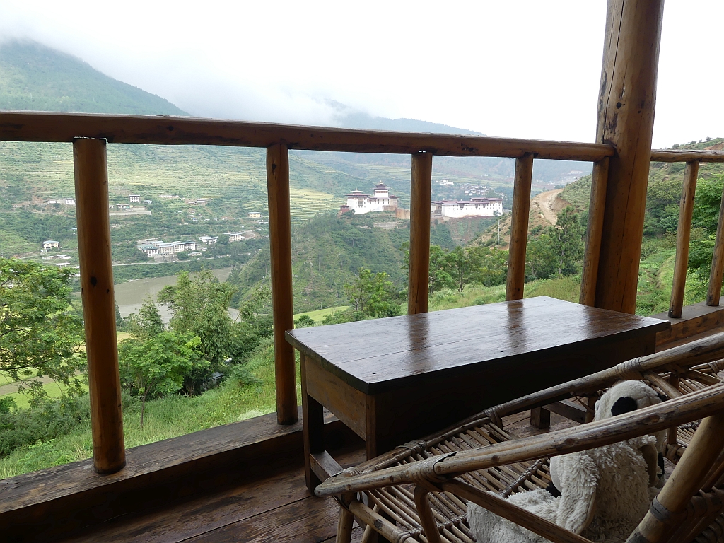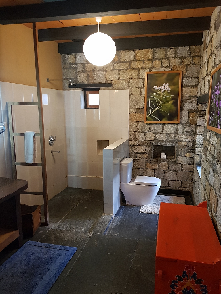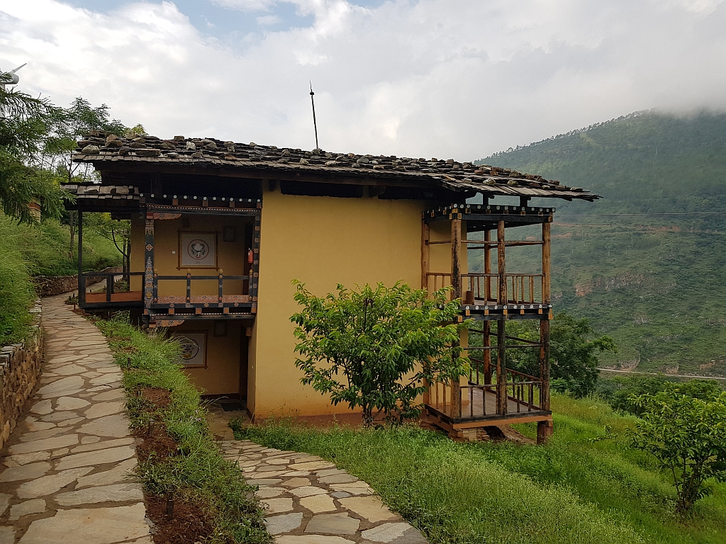 Heute abend haben wir in der Eco Lodge Wangdue übernachtet. Zuerst dachten wir bei der Anfahrt, dass wir noch einen Programmpunkt (Survival-Training oder sowas) übersehen hätten. Die Lodge liegt etwas entfernt und so muss man erst einmal in ein Tal hinab, über eine Brücke und dann wieder hinauffahren und das auf einer schlechten Buckelpiste.