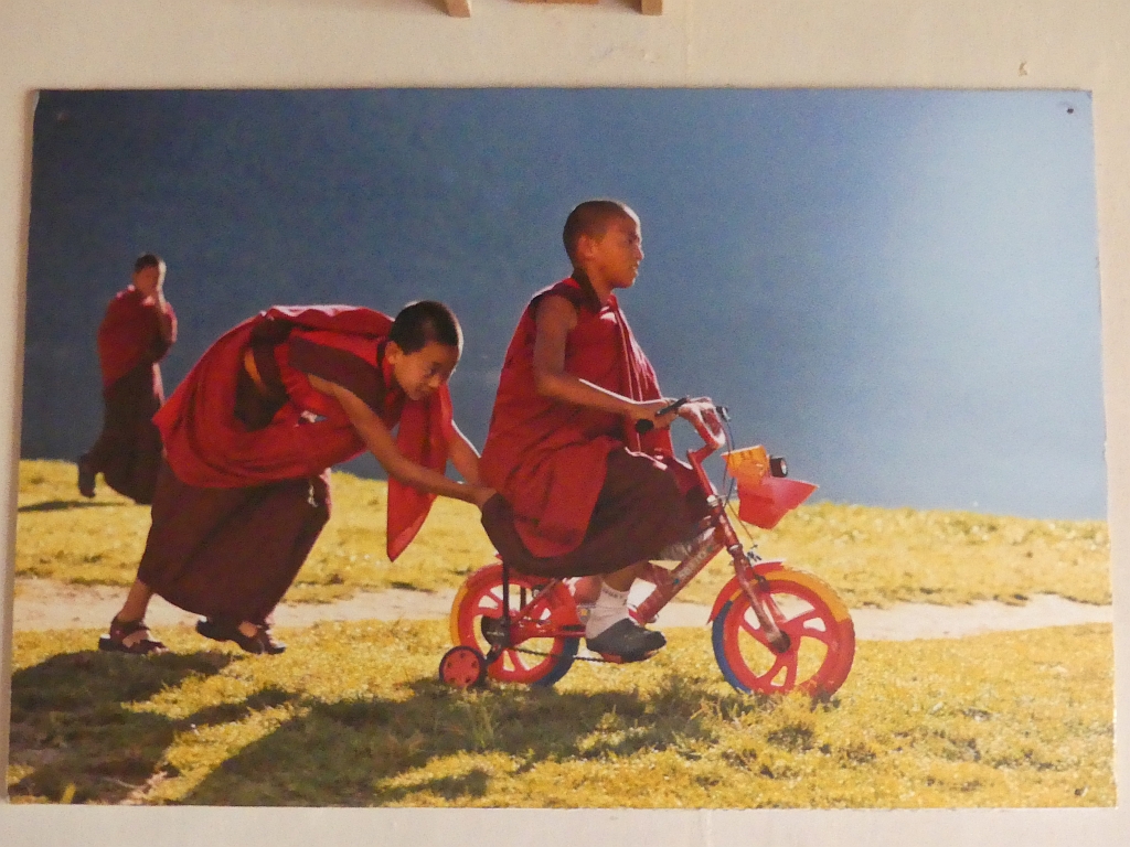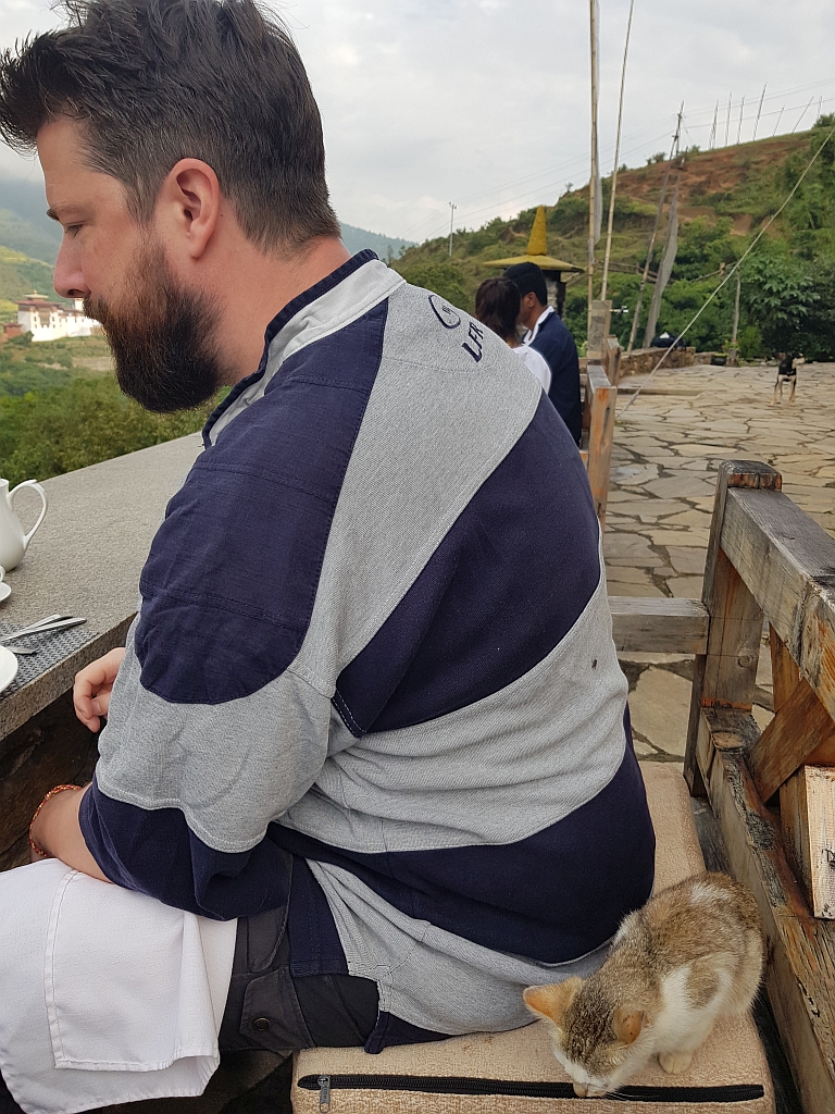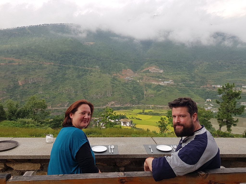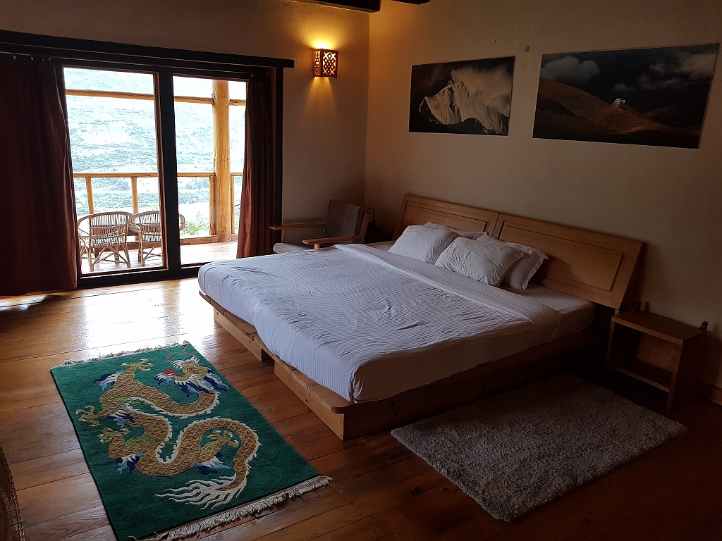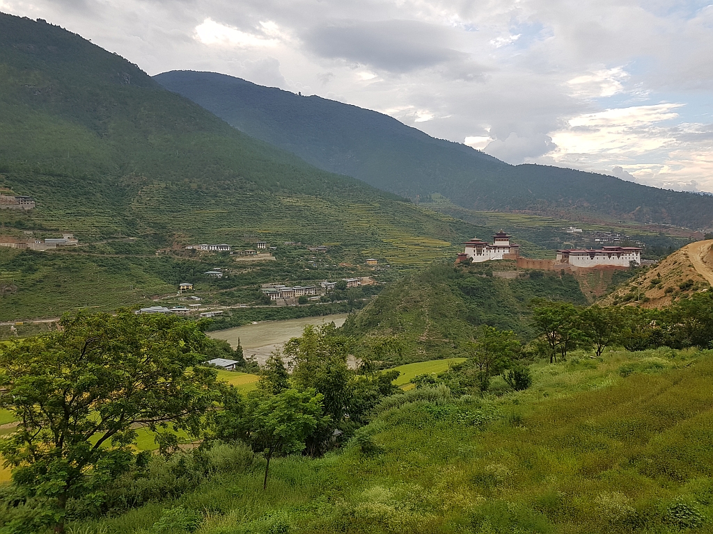 Heute abend haben wir in der Eco Lodge Wangdue übernachtet. Zuerst dachten wir bei der Anfahrt, dass wir noch einen Programmpunkt (Survival-Training oder sowas) übersehen hätten. Die Lodge liegt etwas entfernt und so muss man erst einmal in ein Tal hinab, über eine Brücke und dann wieder hinauffahren und das auf einer schlechten Buckelpiste.