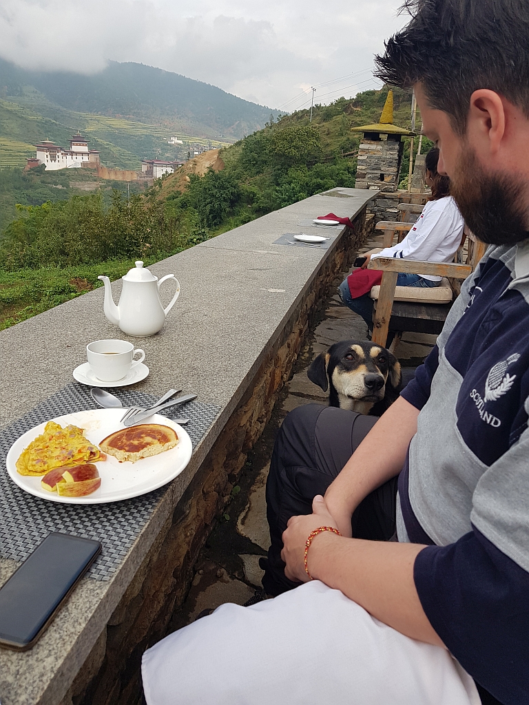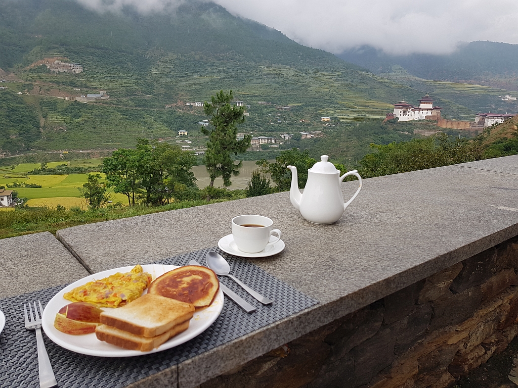 Dann ab auf das Zimmer, schlafen, aufwachen und frühstücken. Hier in der Open-Air Variante.