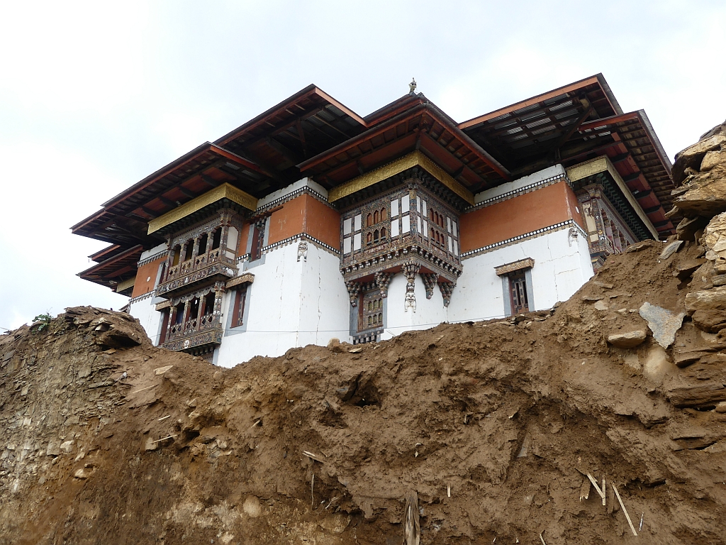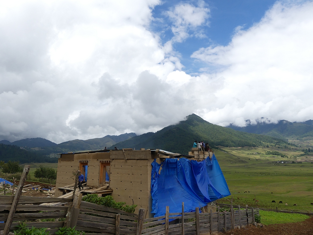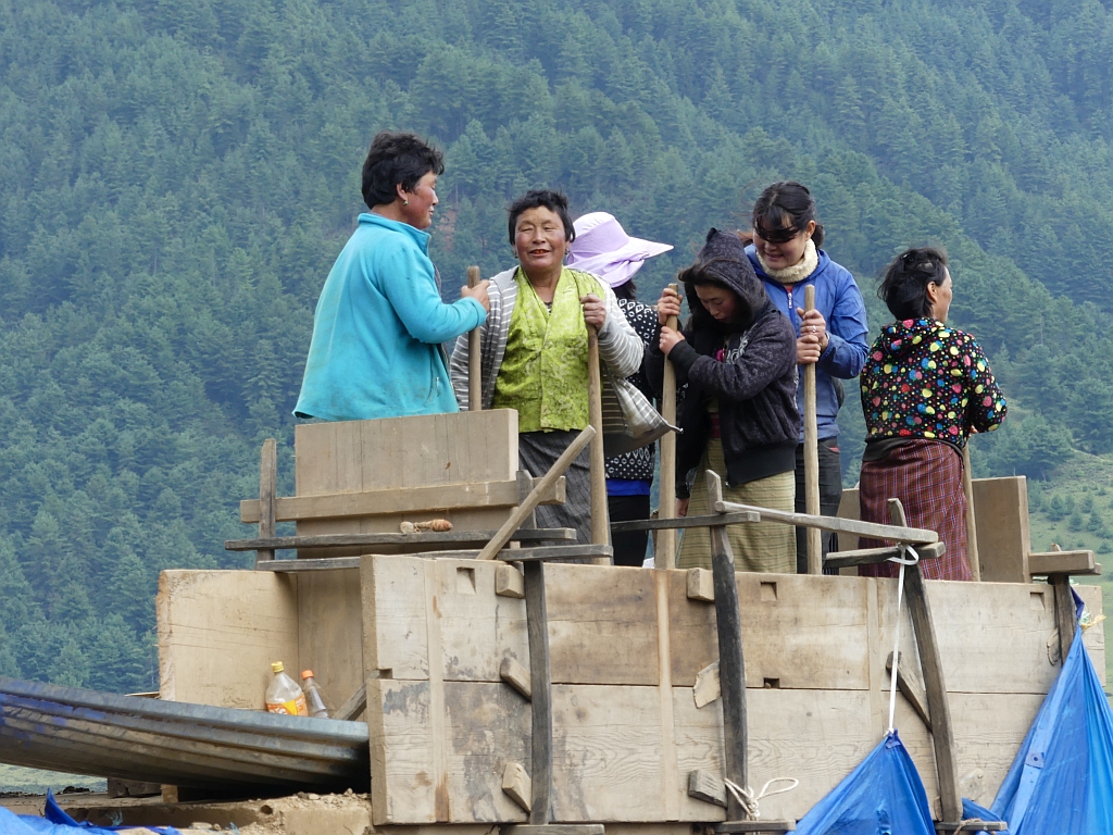 Auf dem Weg erblickte Norbu ein Haus, was nach der traditionellen Lehm-Bauweise erbaut wird. Hier werden die einzelnen Blöcke der Häuserwand verschalt, mit Lehm und Stroh gefüllt und dann mit Muskelkraft (vorwiegend der der Beine) festgetrampelt.