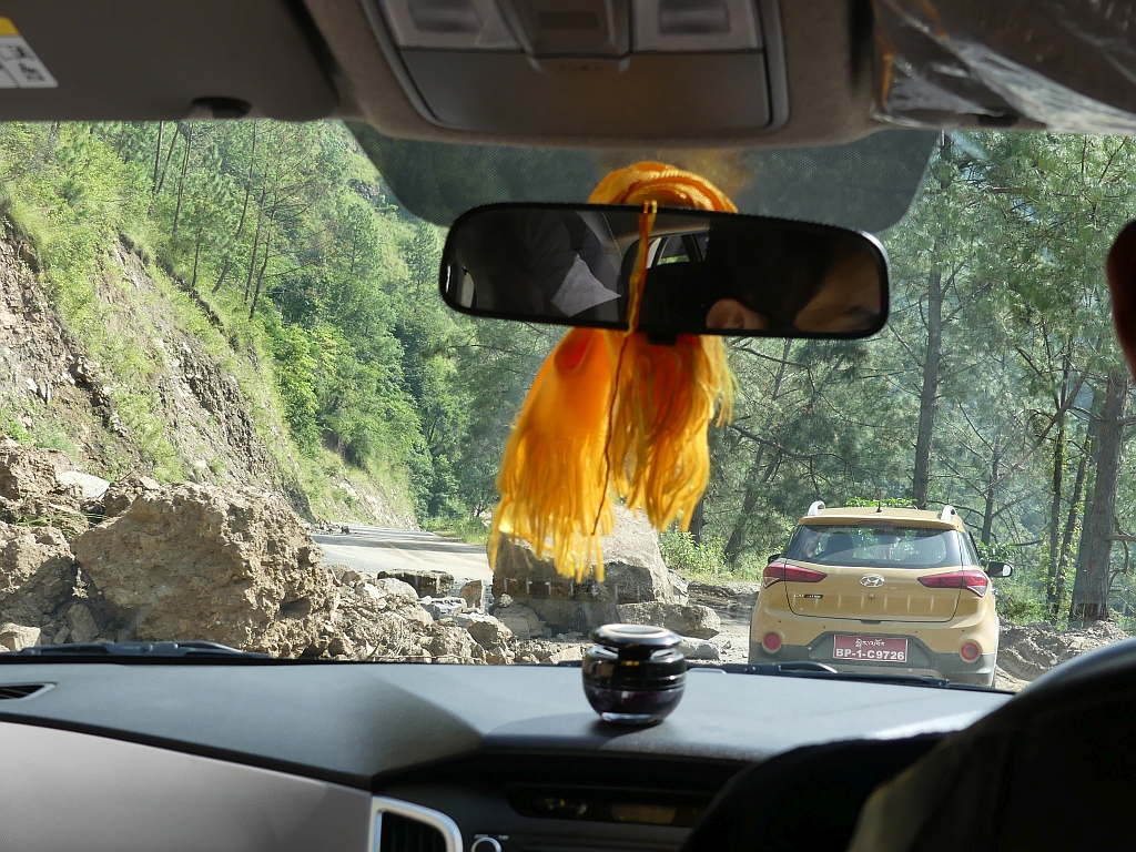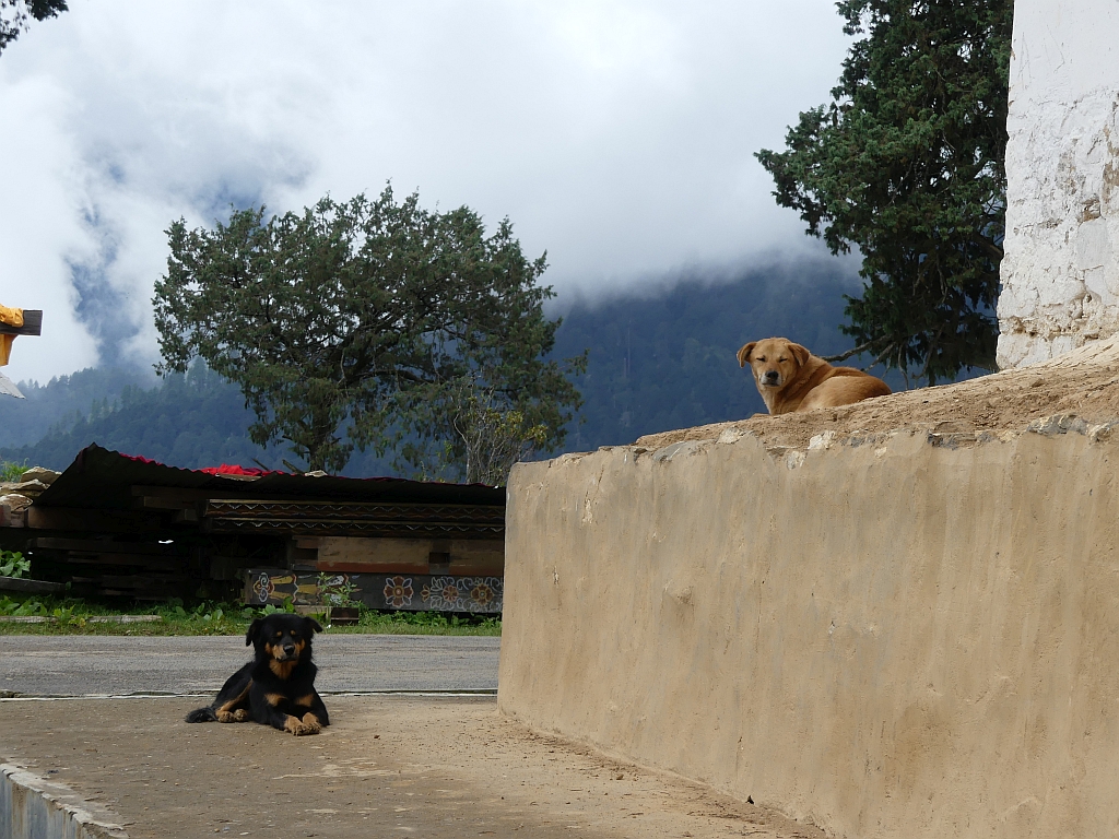 Und dann hinab ins Tal. Die Strecke runter war, genau wie der Weg auf den Pass, recht leer. Was nicht bedeutet, dass man nicht auch entgegenkommenden LKWs, schneller fahrenden Transportern, Bussen und Autos, Kühen, Hunden oder Steinen ausweichen muss. Autofahren in Bhutan ist echt anstrengend, selbst als Beifahrer auf der Rückbank. Außer man ist wie Meike, die sobald sie im Auto sitzt und sich das Auto bewegt, einschlafen kann.