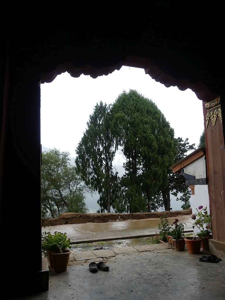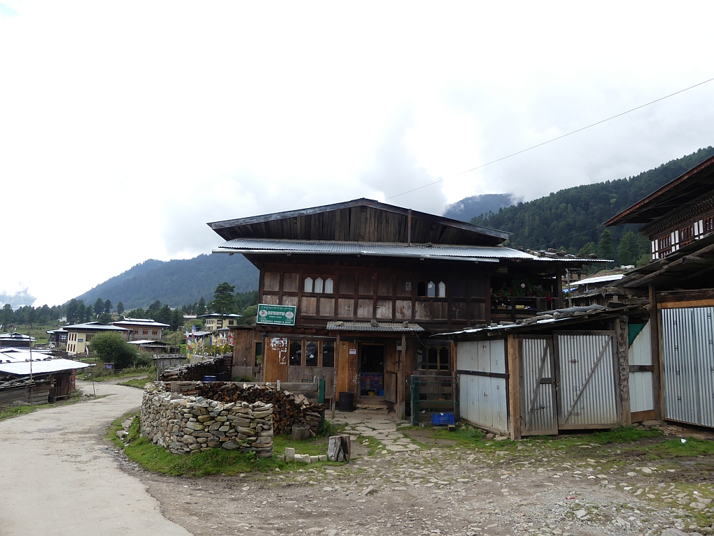 Schlecht: Wir wollten eigentlich jetzt einen kleinen Trek wandern, den Gangtey Nature Trek. Das machte im Regen aber keinen Sinn, erst Recht, weil wir danach ja noch Dinge unternehmen wollten. Und das klatschnass würde auch unangenehm werden. Also haben wir das Mittagessen vorgezogen, welches wir heute in einem Farmhouse, also einem bhutanesischen Bauernhaus, einnehmen würden.