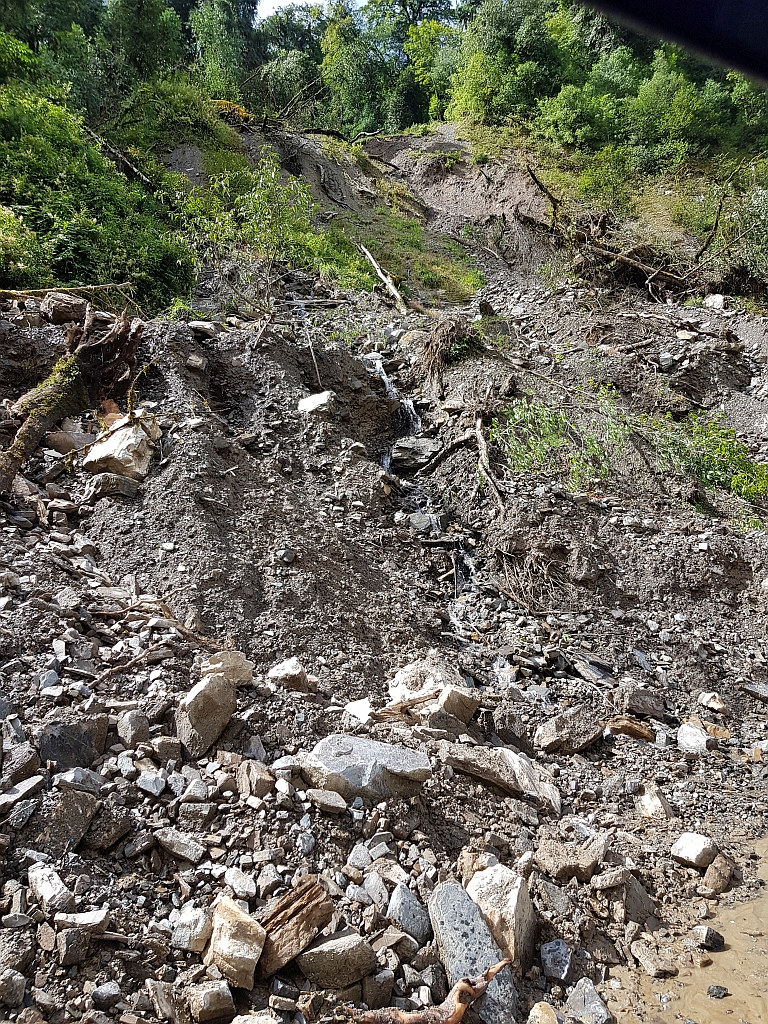 Steine und Erde, die vom Hang auf die Strasse fallen, sind nichts außergewöhnliches und werden erst nach einer Weile weggeräumt. Das bedeutet: Der Verkehr muss sich um die Steine herumschlängeln.
