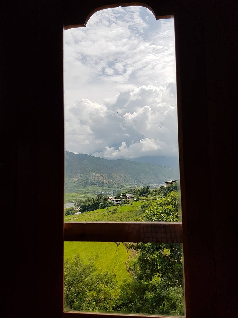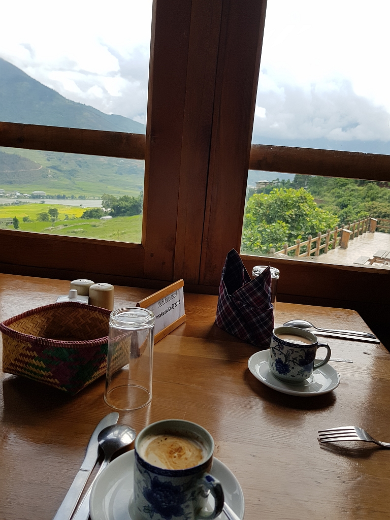 Als nächsten Ort wollten wir die Gegend um Punakha besuchen. Daher hieß es für uns mal wieder: Koffer packen, frühstücken (angesichts der Massen an Essen gestern sehr, sehr wenig frühstücken), das eine Bier des Abends bezahlen (in der Regel so um die 200 Ngultrum, also 2,50 Euro), versuchen einen der Koffer oder Rucksäcke selber zum Auto tragen zu dürfen (gelingt sehr selten, Guide und Driver sind sehr schnell) und dann ins Auto einsteigen.