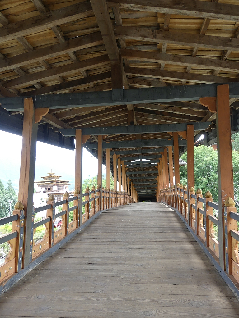 Das gesamte Gebäude ist 180 Meter lang und 72 Meter breit und hat drei Innenhöfe – jeder mit einer spezifischen Bedeutung. Zum Dzong selber und den weiteren Gebäuden für die Mönche kommt man über eine Brücke über den Mo Chhu, die nach Überflutungen zerstört wurde. 2006 wurde diese vom deutschen Verein proBhutan restauriert und wiedererrichtet. Der Verein hat in dieser Gegend noch weitere Projekte wie beispielsweise ein Krankenhaus. Über diese Brücke ging es auf jeden Fall dann auch für uns auf die Halbinsel auf der das Dzong liegt. Vorbei am völlig desinteressierten Wachhund …