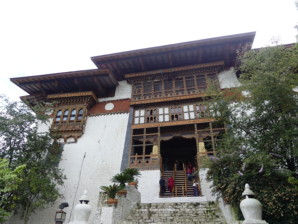 Der Eingang zum Dzong wird von einer sehr steilen Treppe dominiert. Rollstuhlfreundlich ist das halt nicht, aber es diente ja auch der Verteidigung.