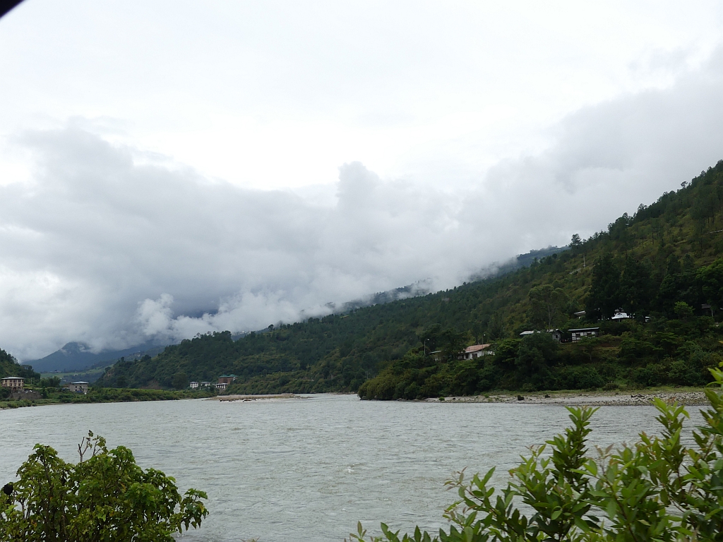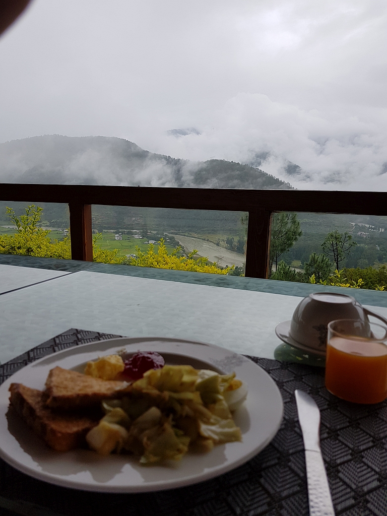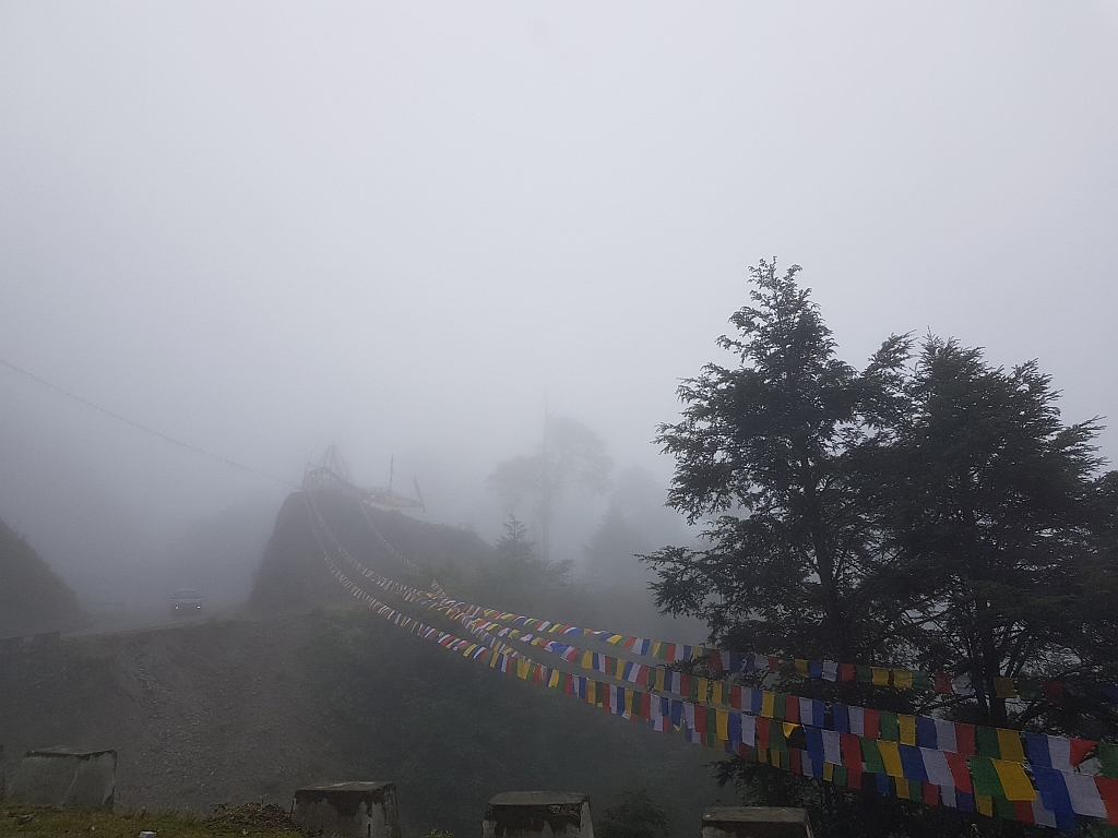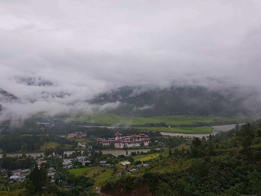 Als wir etwas zerstochen in Punakha aufgewacht waren, sahen wir eher mistiges und wolkiges Wetter.