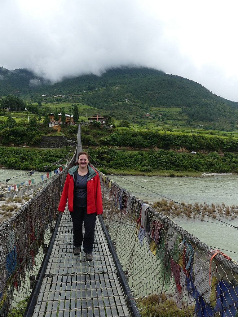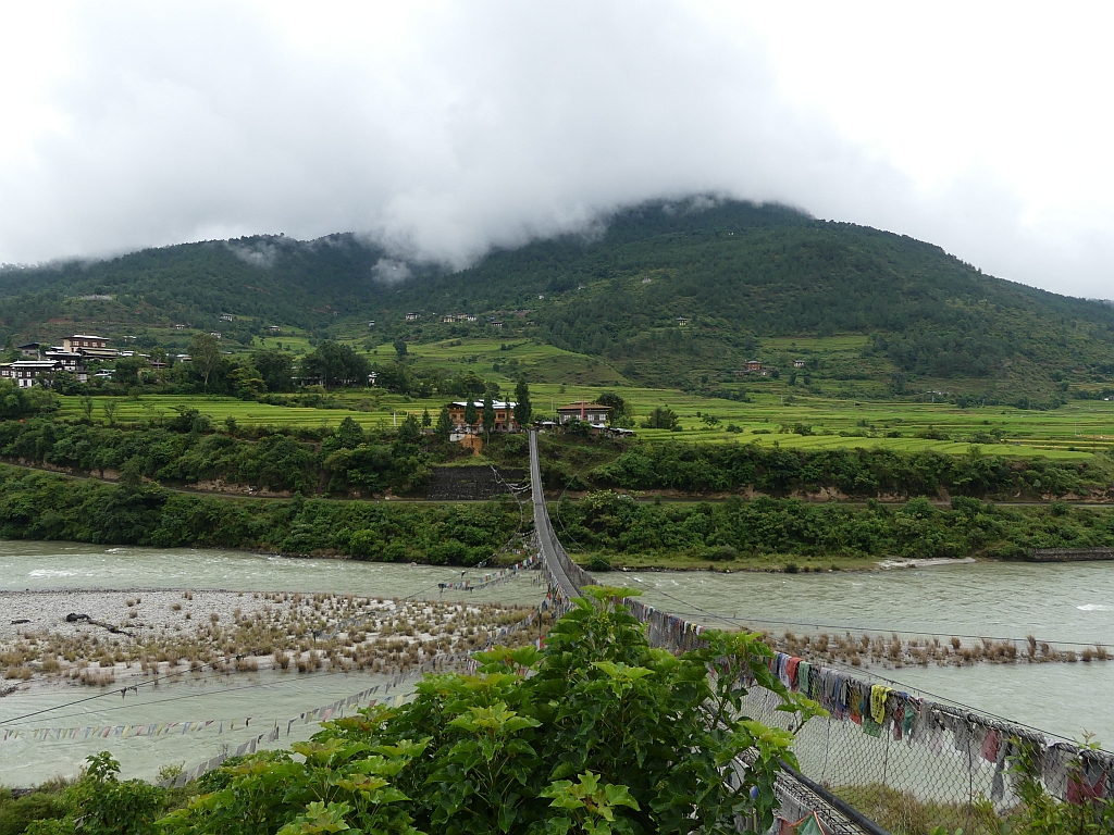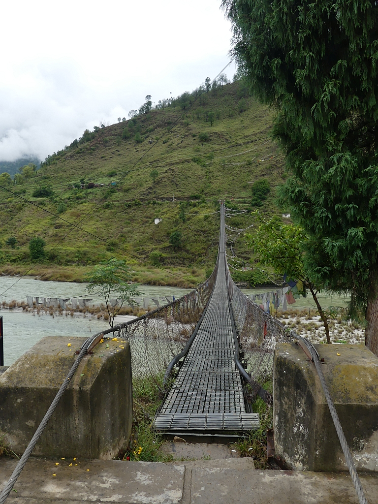 Diese 350 Meter lange Hängebrücke über de Po Chhu (Mutter Fluss) verbindet viele kleine Ortschaften und Landhäuser mit dem Dzong, welcher ansonsten nur mit einem sehr lange Umweg über die etwa 5 Kilometer entfernte Autobrücke zu erreichen wäre. Und zum Dzong muss man eben nicht nur aus religiösen Gründen, sondern eben auch für die auch hier nötigen Gänge zum Amt.
