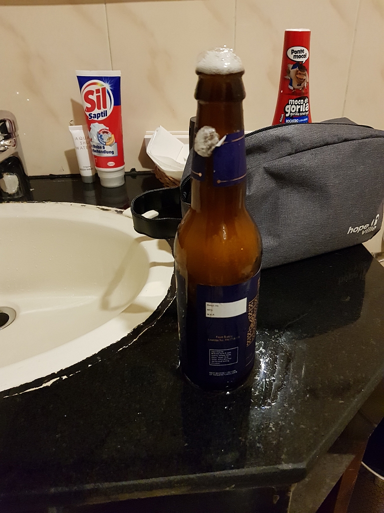 Wo wir dann auf dem Zimmer noch ein Bier und ein Cider aus der Minibar zum Preis von 68 Cents pro Flasche trinken wollten. Was beim Wheatbeer durch den auf Nordpol eingestellten Kühlschrank eher zu einem Wheatbeer-Ice und einer kleinen Überschwemmung wurde.