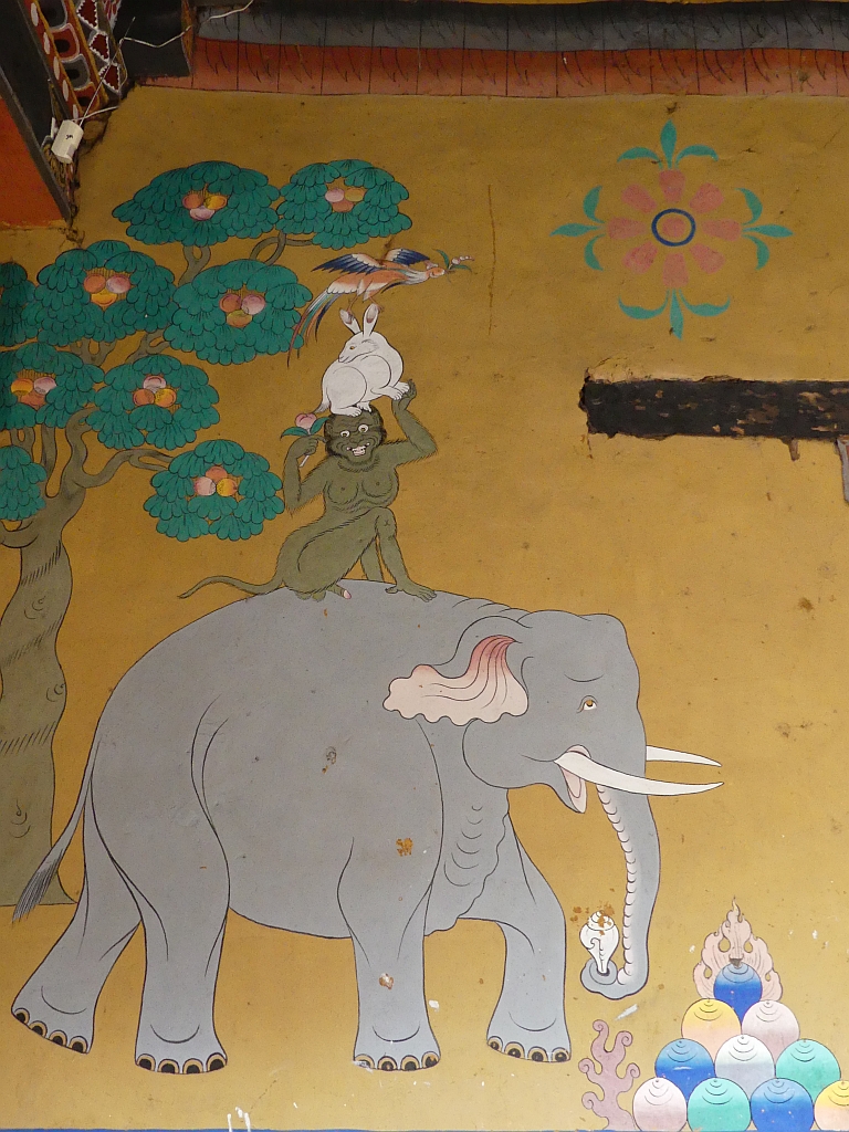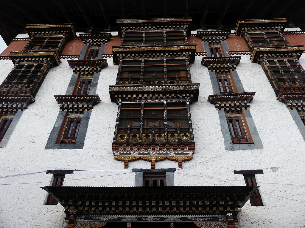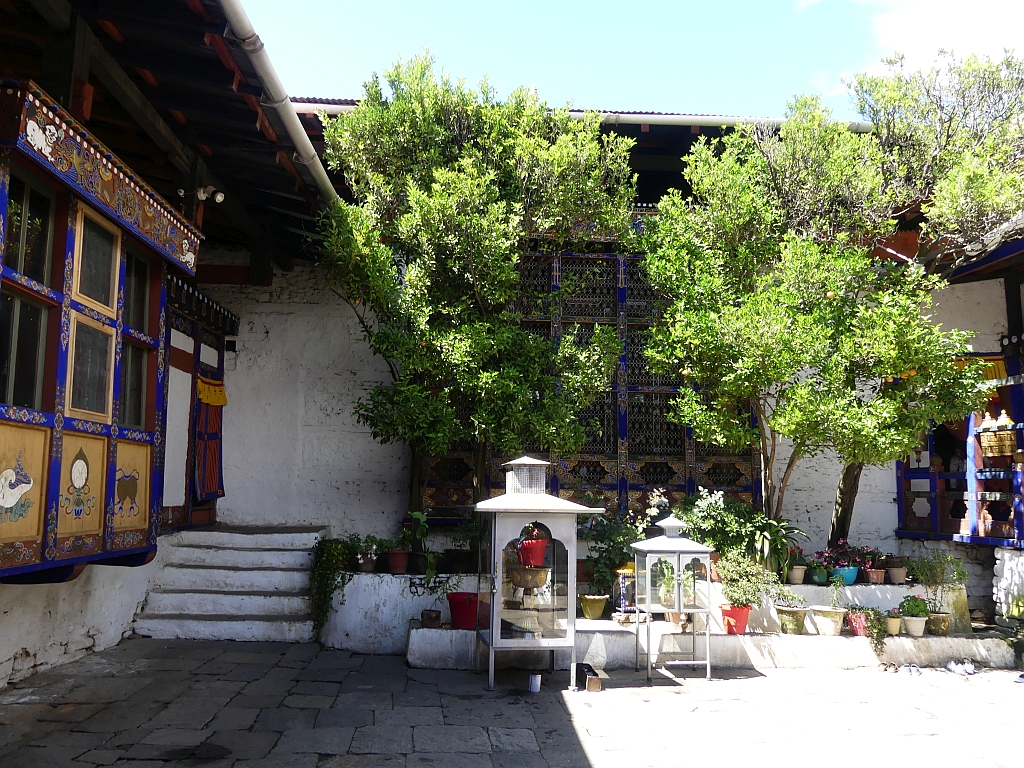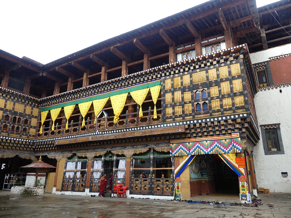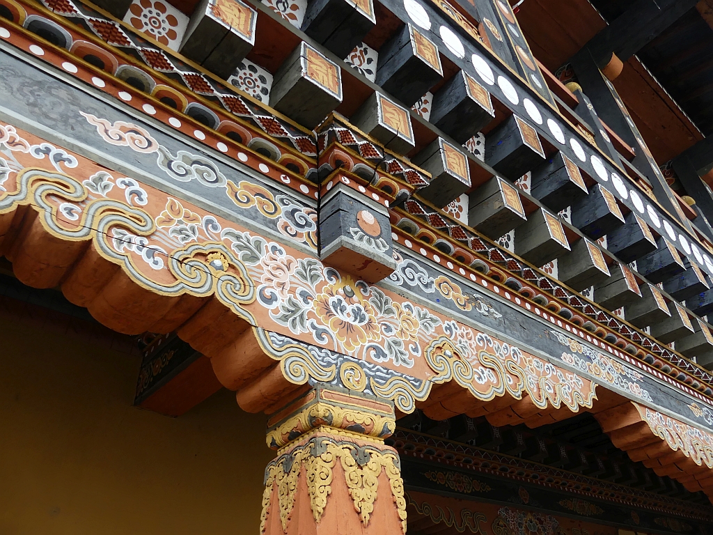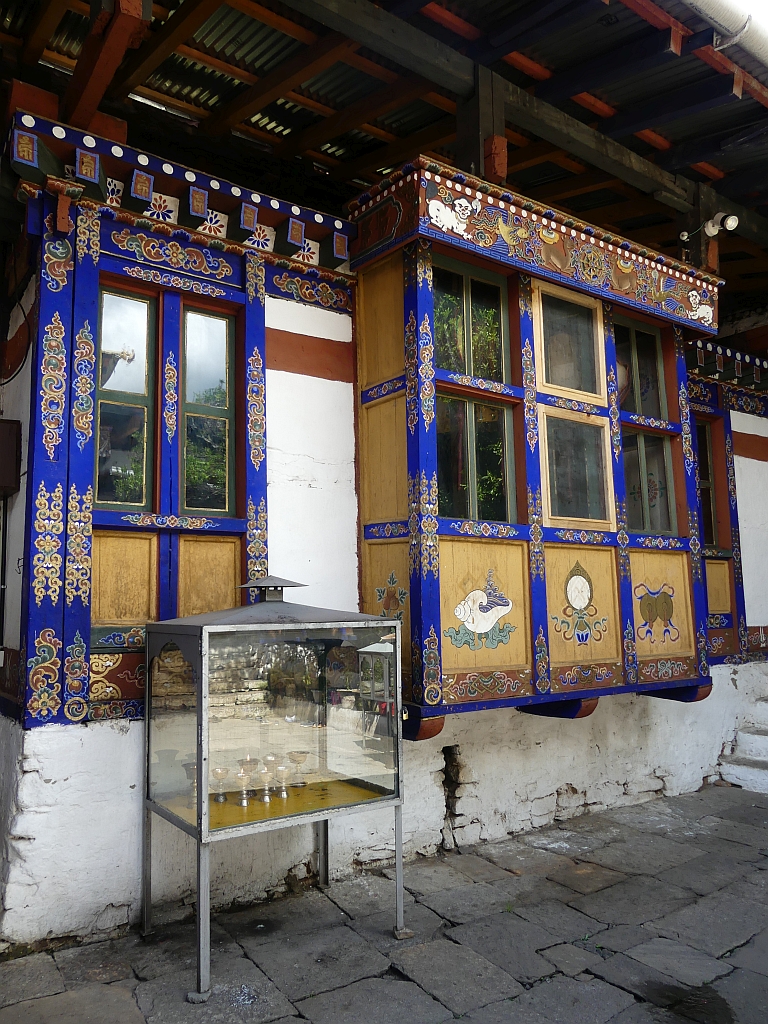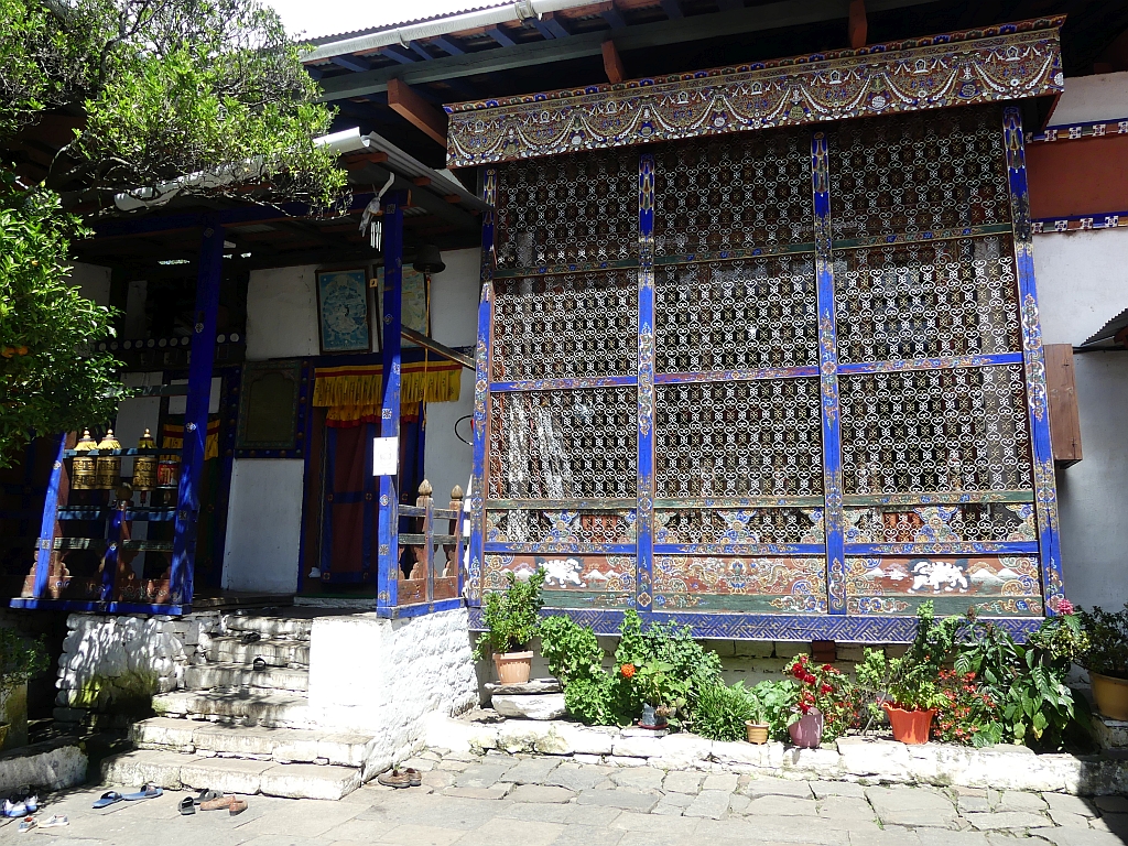 Auch hier waren wieder viele fein gearbeitete Malereien an den Wänden zu sehen und die anderen traditionellen Kunstfertigkeiten, die wir ja auch an den anderen Dzongs und in der Schule in Paro gesehen haben.