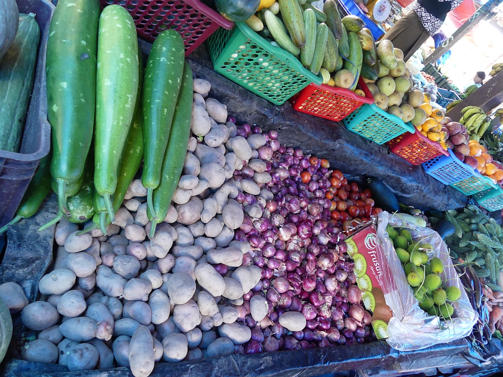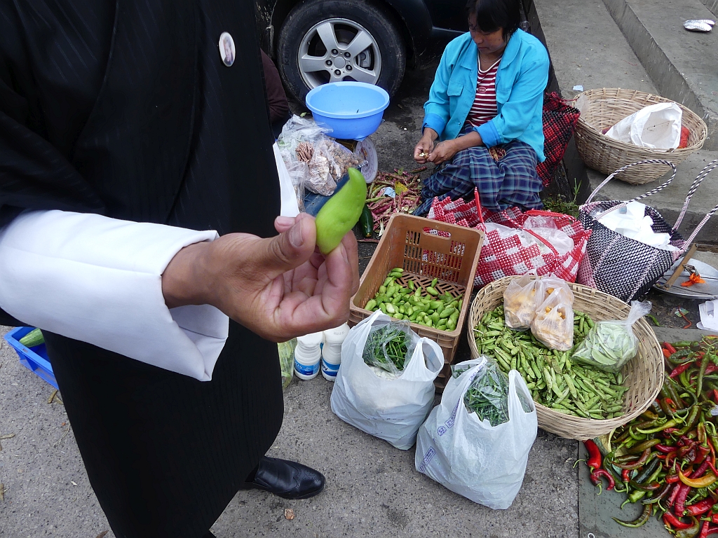 Ansonsten gab es überraschend viel Gemüse – das meiste davon wird auch hier angebaut. Es wird aber generell auch viel importiert – fast alles aus Indien – was auch daran liegt, dass es in Bhutan wenige Möglichkeiten zur Lagerung von Gemüse gibt. Kartoffeln werden zum Beispiel im Phobjikha angebaut, nach Indien verkauft und für ein Vielfaches wieder eingekauft. Ein schlechtes Geschäft für Bhutan.
