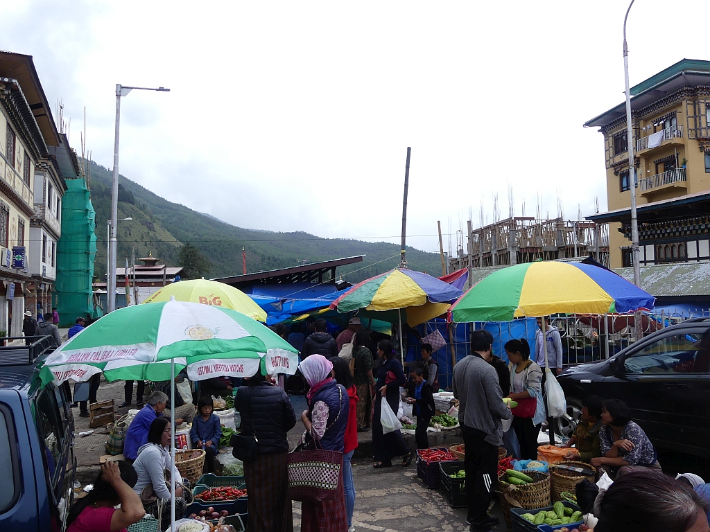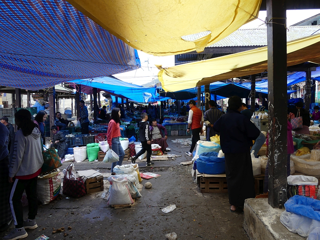 Der Markt in Paro ist noch ein alter Markt – der in Thimphu oder auch in Haa war ja schon moderner mit Dach und Betonboden und so. Hier waren es noch Zeltplanen auf dem Boden.