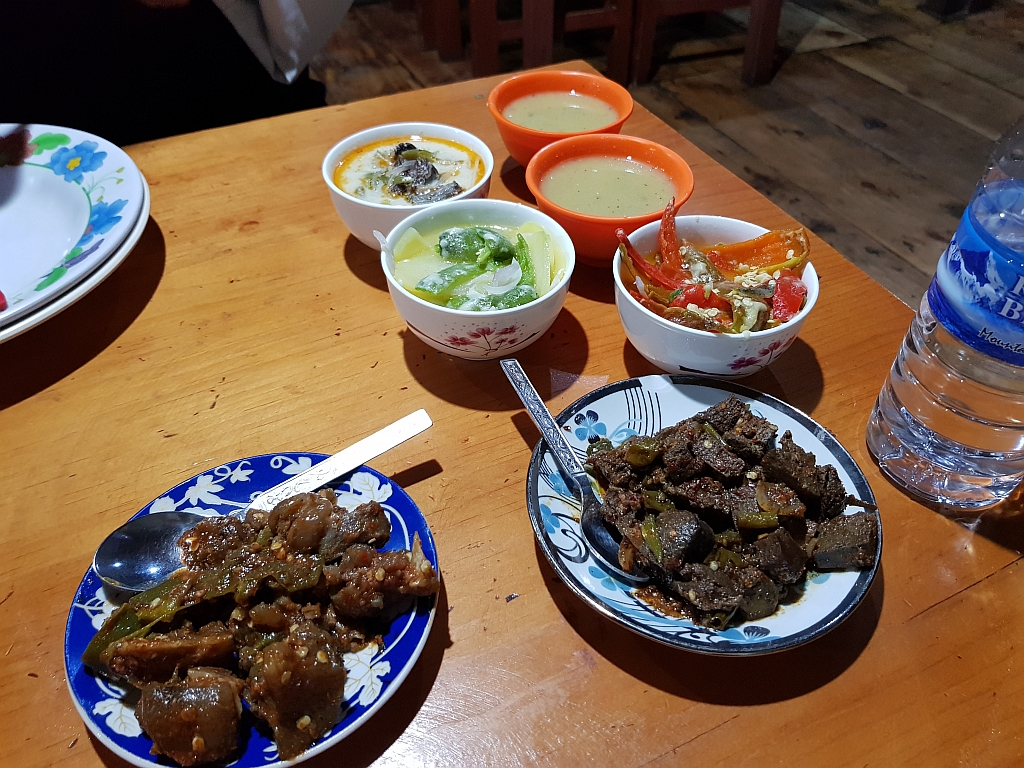 Generell war es alles erst einmal lecker, nur das Rindfleisch (Sehr interessant, dass wir auch Rindfleisch bekamen!) war recht zäh. Die Leber in Buttermilch war interessant, aber nicht unser Fall. Das Dal war super und fast schon wie eine Gemüsebrühe. Und die Chili war nicht für Touristen, sondern für den anspruchsvollen Bhutanesen.