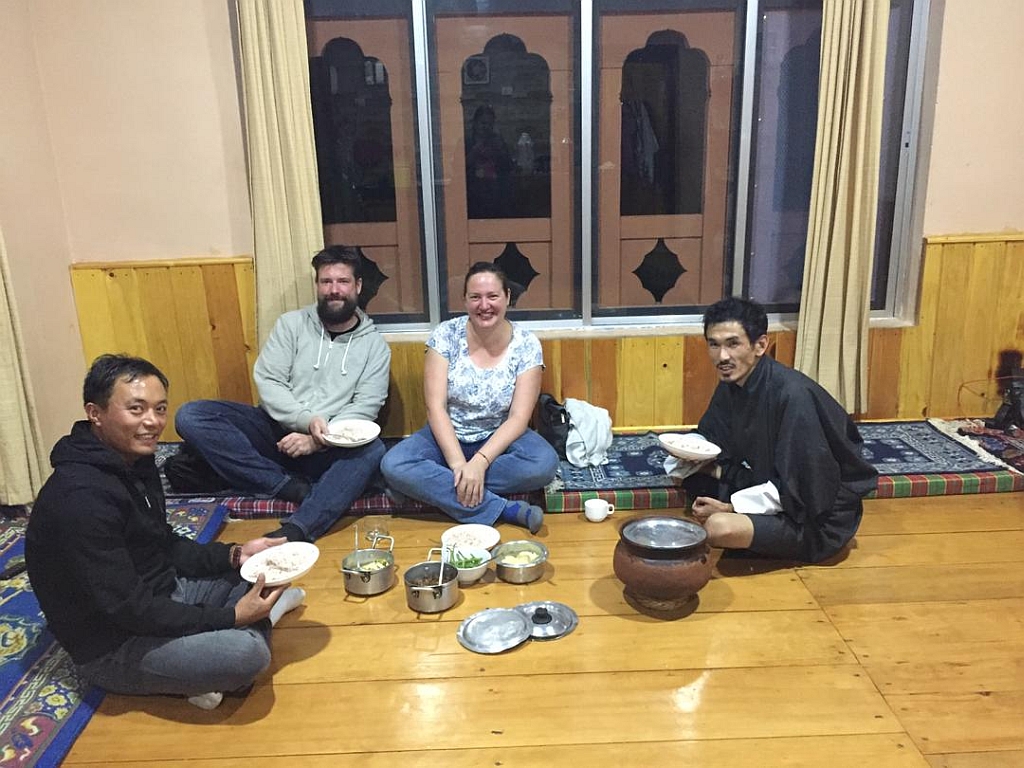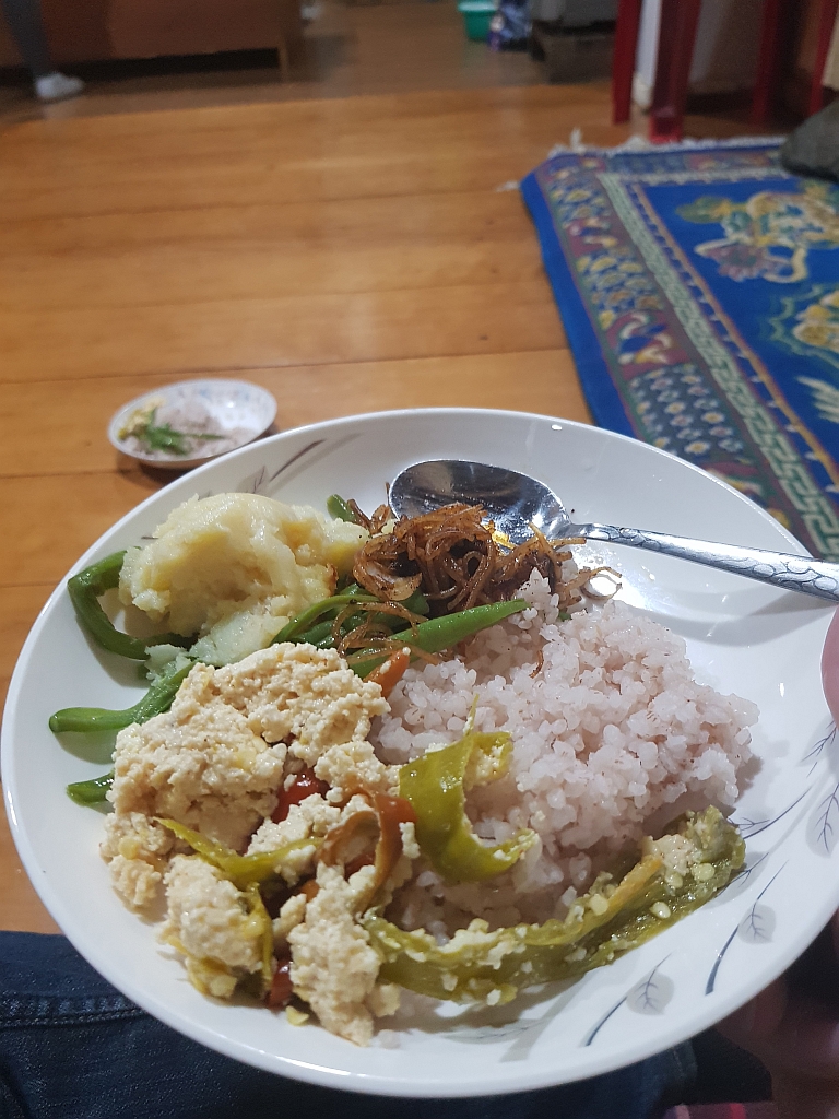 Die Dame des Hauses sprach sogar recht gut Englisch, sodass wir uns nachher noch nett unterhalten haben. Aber vorher: Abendbrot! Ein letztes Mal in Bhutan.