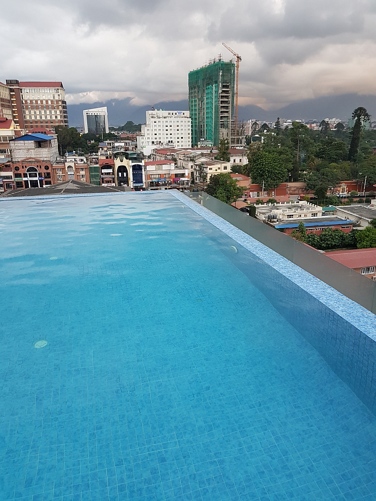 Gut für uns zum Runterkommen: Das Hotel hat einen Pool auf dem Dach, von dem man den Moloch Kathmandu beobachten kann.