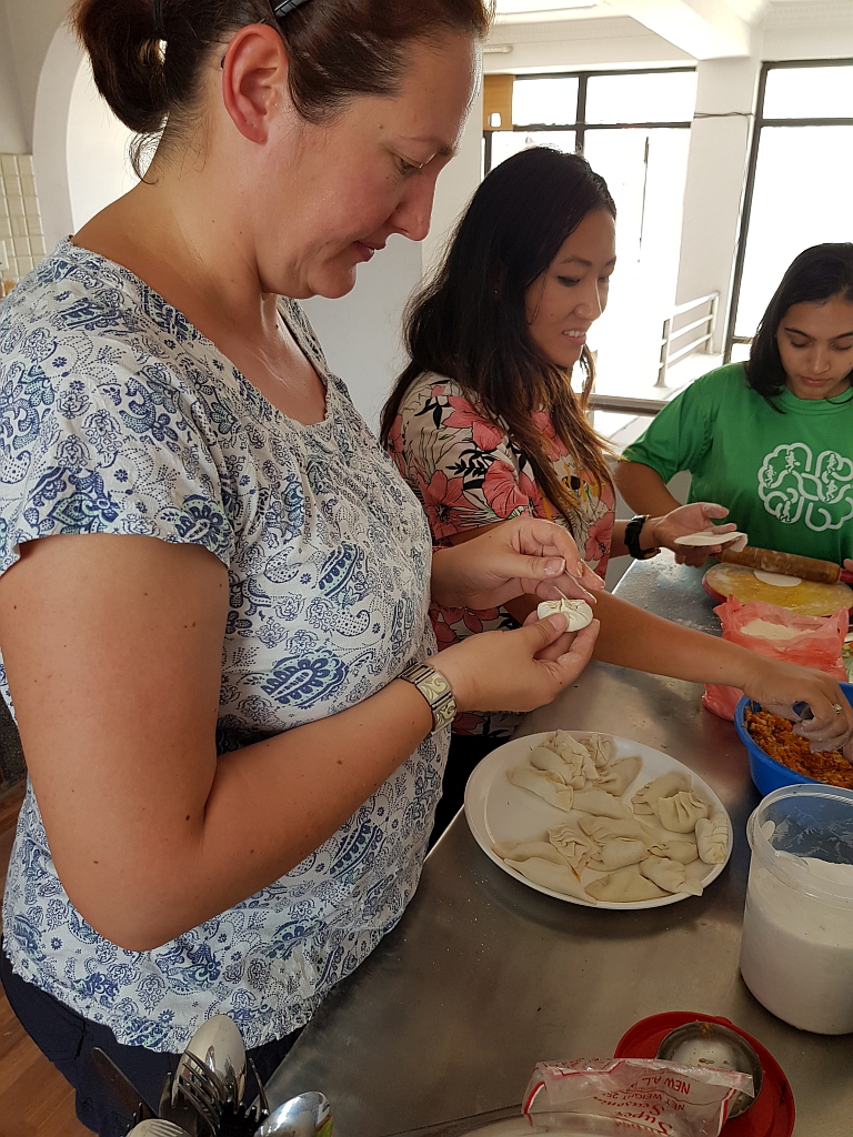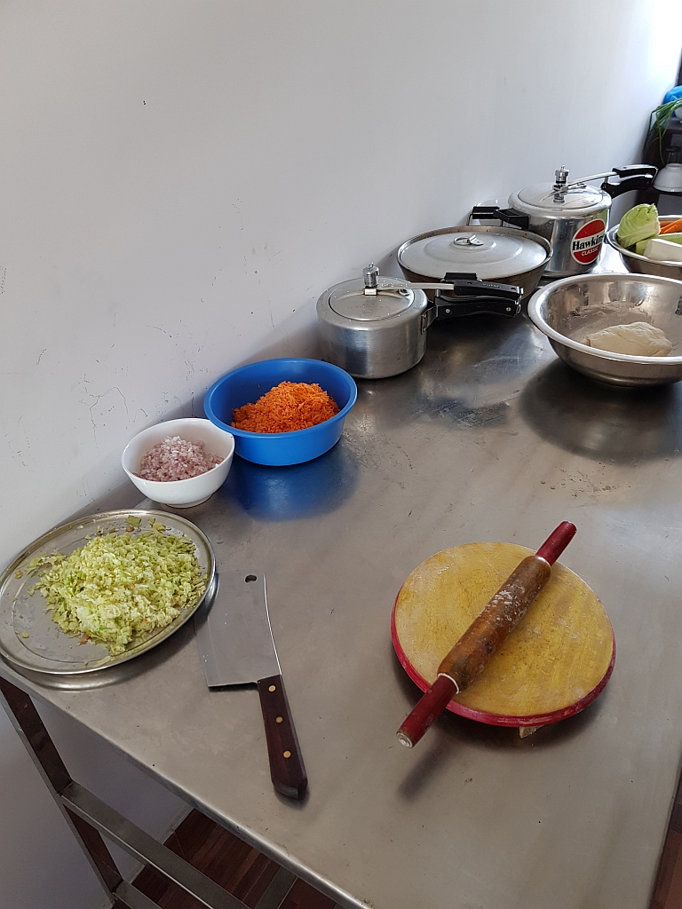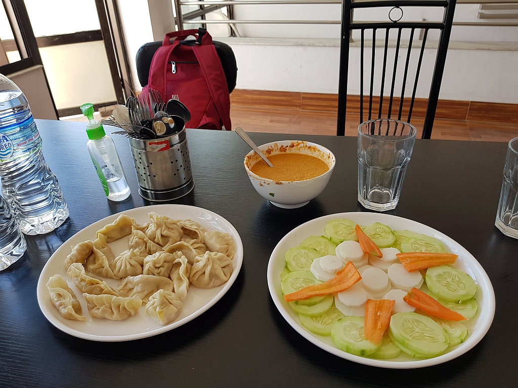 Also: Wir hatten uns vorher Momos gewünscht. Momos sind eine nepalesische Teigtasche, die den deutschen Maultaschen, italienischen Ravioli, chinesischen Jiaozi oder russischen Pelmeni ähneln. Sie werden aus einem Nudelteil hergestellt, dann mit unterschiedlichen Füllungen zu Teigtaschen geformt und dampfgegart. Als Füllung gab es Karotten, Zwiebeln, Kohl und eine Gewürzmischung.