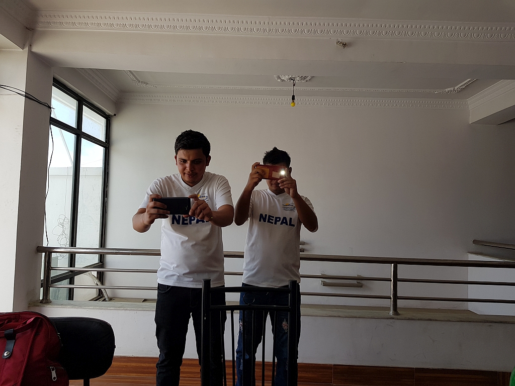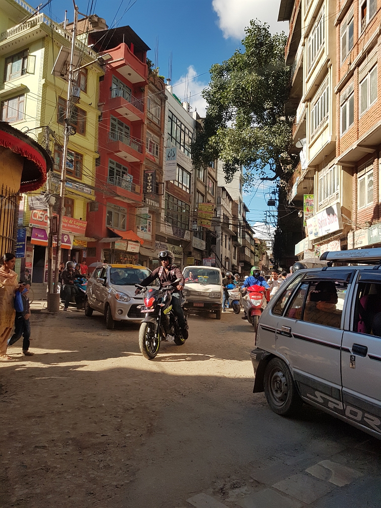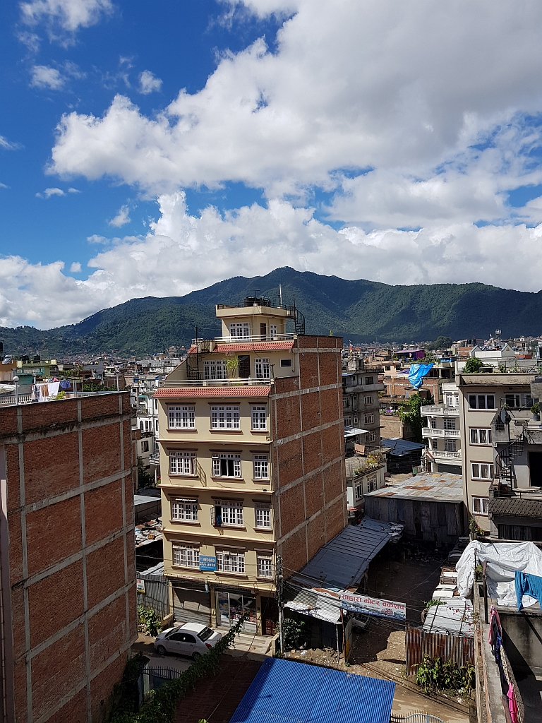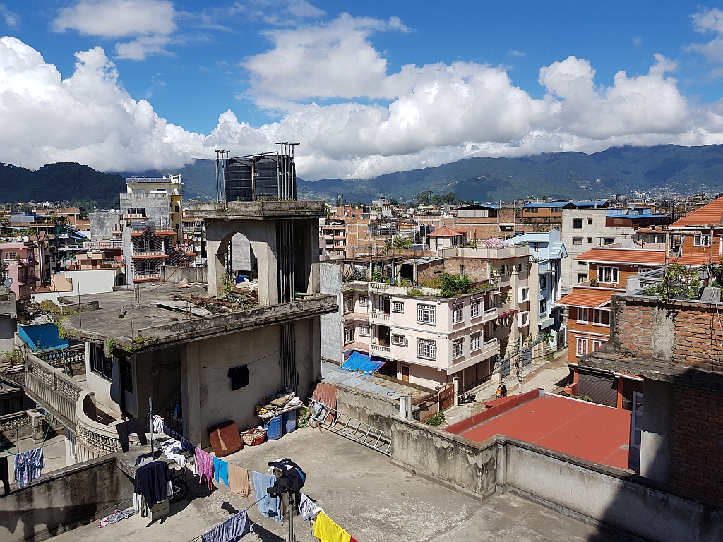 Einerseits weil er nicht in die Momos husten wollte (der Staub in Kathmandu ist wirklich nicht so gut, wenn man Husten hat), andererseits weil er dabei wirklich ziemlich unbrauchbar war, konnte Jens dann vom Dach des Gebäudes, in dem die Agentur ihren Sitz hat, ein paar Fotos von einem eher Business-Stadtteil Kathmandus machen.