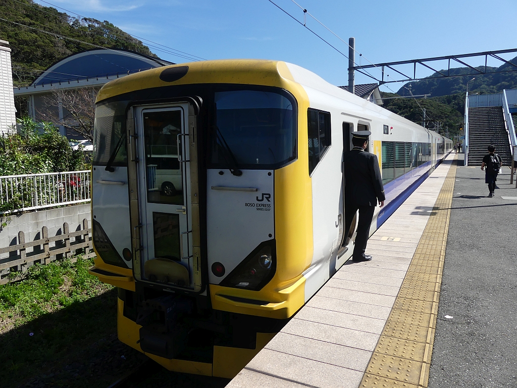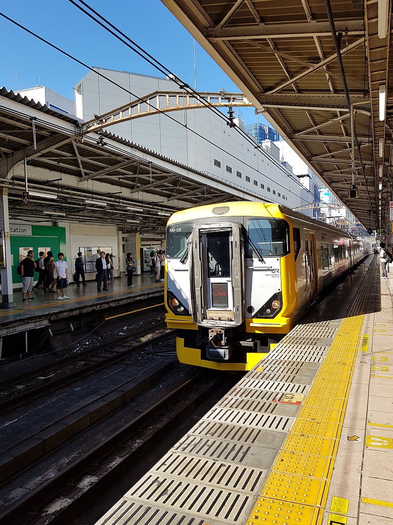 Der Shinjuku Sazanami Limited Express verkehrt zwischen Shinkuju und Chikura. Und hält auch in Akihabara, wo wir wiederum gut hinkamen. Dort verkehr der Limited Express auf den Gleisen der Keiyo Linie, deren Wagen schon die Logos für die olympischen Spiele 2020 in Tokyo zieren.