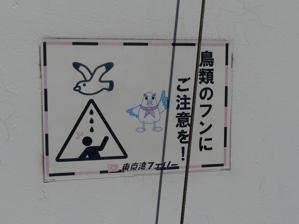 Dieses Warnschild war auf der Fähre, die wir anstelle der Bahnfahrt für unseren Rückweg genommen haben. Diese verbindet nämlich Tateyama mit Kurihama auf der anderen Seite der Bucht und von dort aus fahren Züge nach Tokyo. Vorteil für uns wäre, neben der Seefahrt und der damit verbundenen Aussicht, dass diese Züge von Süden nach Tokyo reinfahren und dort ist nunmal auch unser Hotel.
