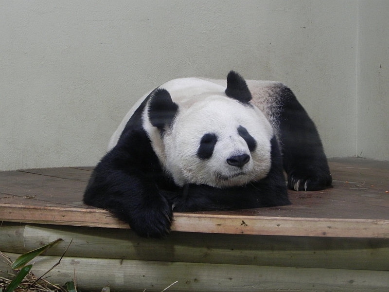 Leider waren wir ein wenig enttäuscht von der Art und Weise, wie die Pandas, oder genauer DER Panda, denn nur einer konnte gezeigt werden weil der andere beim Training war, gezeigt wurden. Der Raum, von wo aus man die Pandas in ihren Gehegen beobachten konnte, war winzig und die anderen 28 Leute waren auch nicht so besonders rücksichtsvoll. Hinzu kam, dass durch das Wetter (kalt, Regen, wie immer, wenn wir hier sind) die Scheiben recht schnell beschlagen haben und man so noch weniger sehen konnte. Der Panda-Dame Tian Tian war das wohl ganz recht, da sie so ihre Ruhe hatte und schlafen konnte.