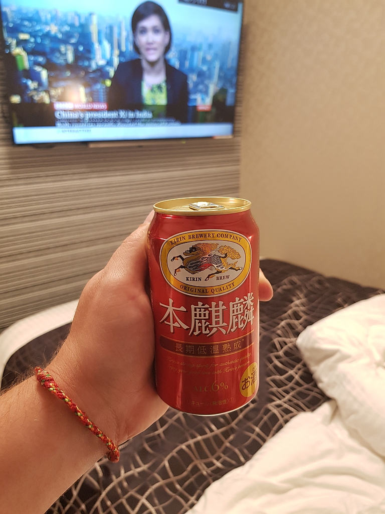 Zwei Sachen haben uns dann unsere Situation erneut überdenken lassen: Einerseits war die Aussicht in einem Zimmer, dessen fast komplette Grundfläche durch das Bett eingenommen wird, 2 Tage zu verbringen nicht besonders erstrebenswert. Auch die zu unser Überraschung in einem Koffer gefundene Bierdose machte das nicht besser. Denn langsam war klar, dass dies ein absoluter Extremfall war und man mehr oder weniger angewiesen wurde, nicht nach draußen zu gehen, während der Taifun Japan im Griff hat.