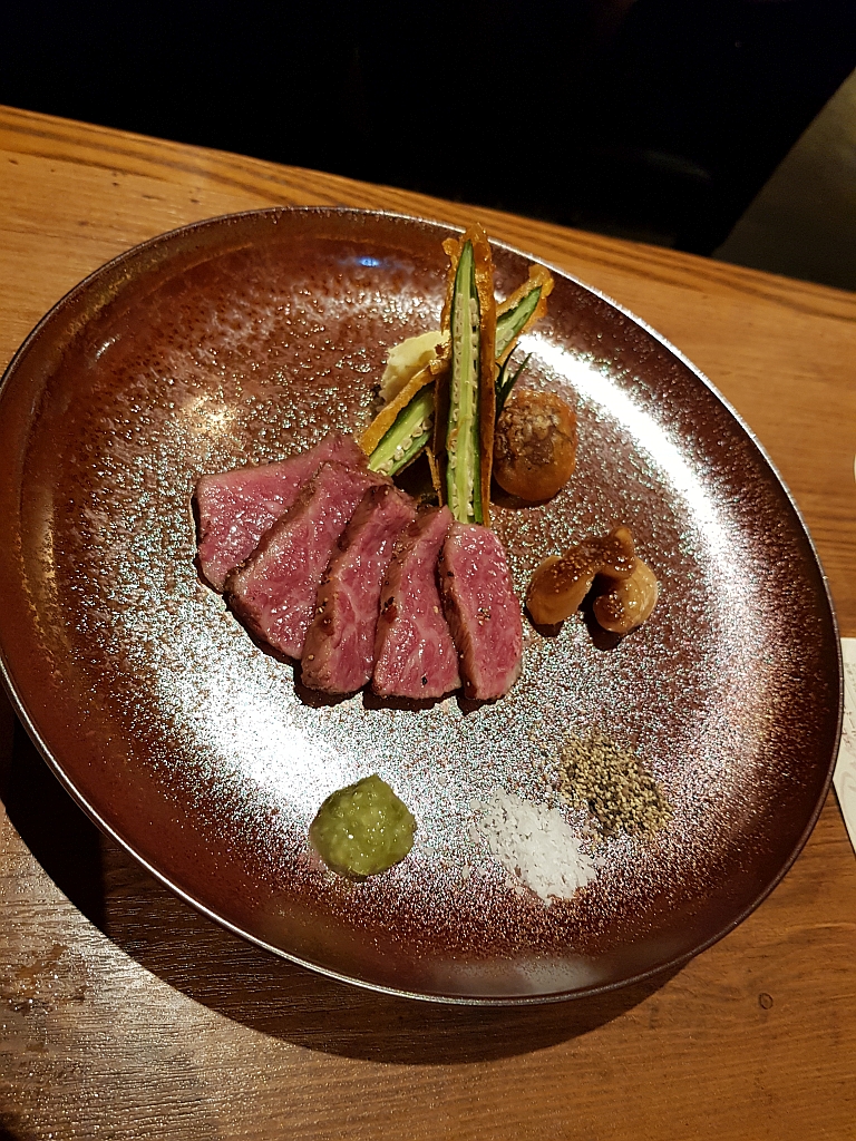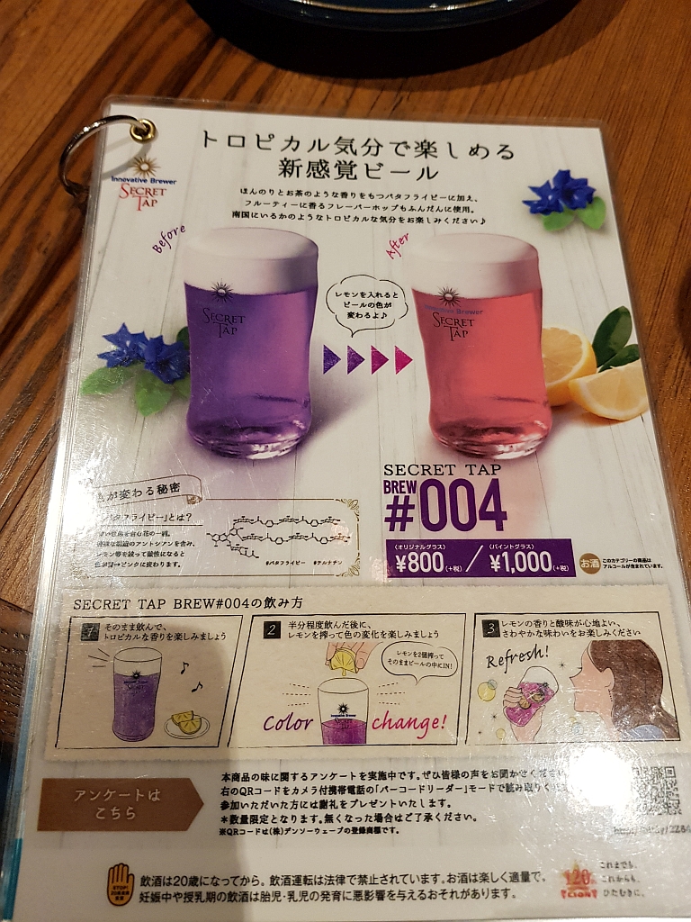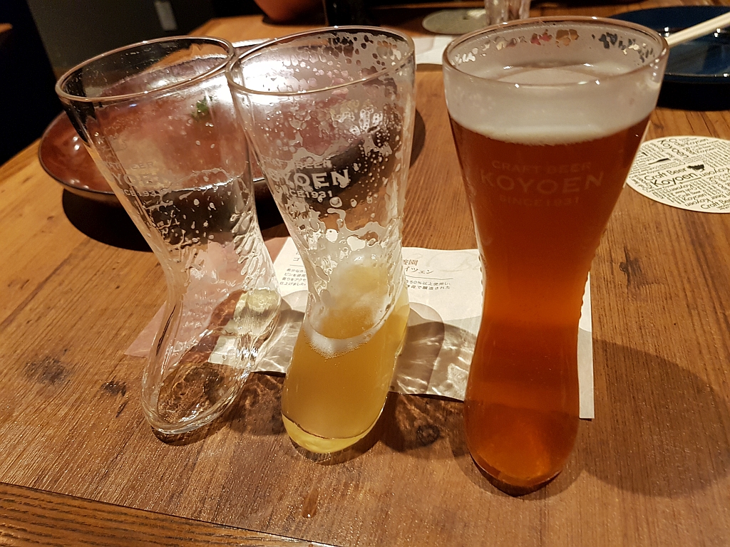 Nachdem wir mit Lena noch gequatscht haben, sind wir auf unser Zimmer im JR Central Hotel gegangen und haben und dort ausgeruht, gebloggt und überlegt, was wir den nächsten Tag machen wollen. Und da uns irgendwie im Zimmer die Decke auf den Kopf fiel, sind wir in eine nahe Brauerei gegangen, wo eine verlockende „Kleinigkeit“ namens Kobe-Beef auf der Speisekarte war. Die Bestellung hatte also nix mit Hunger zu tun, sondern eher mit Verlangen.