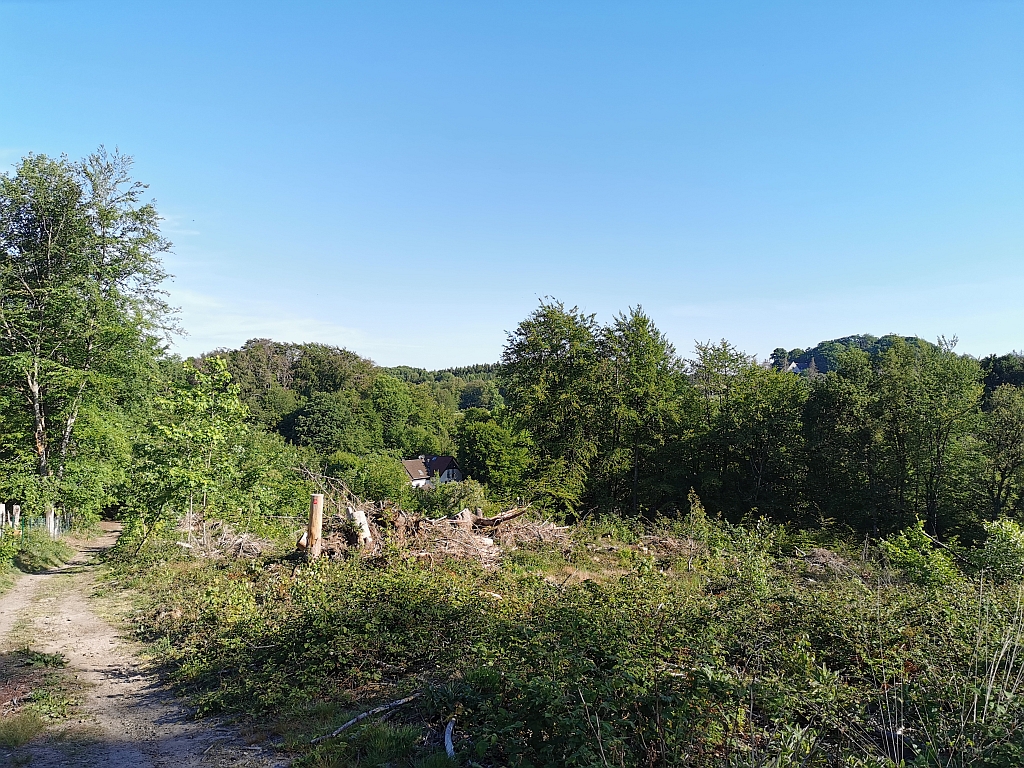 Eine kleine Steigung hinauf zeigte Beispiele für die immer noch zu sehenden Zerstörungen der letzten Orkane im Bergischen Land.