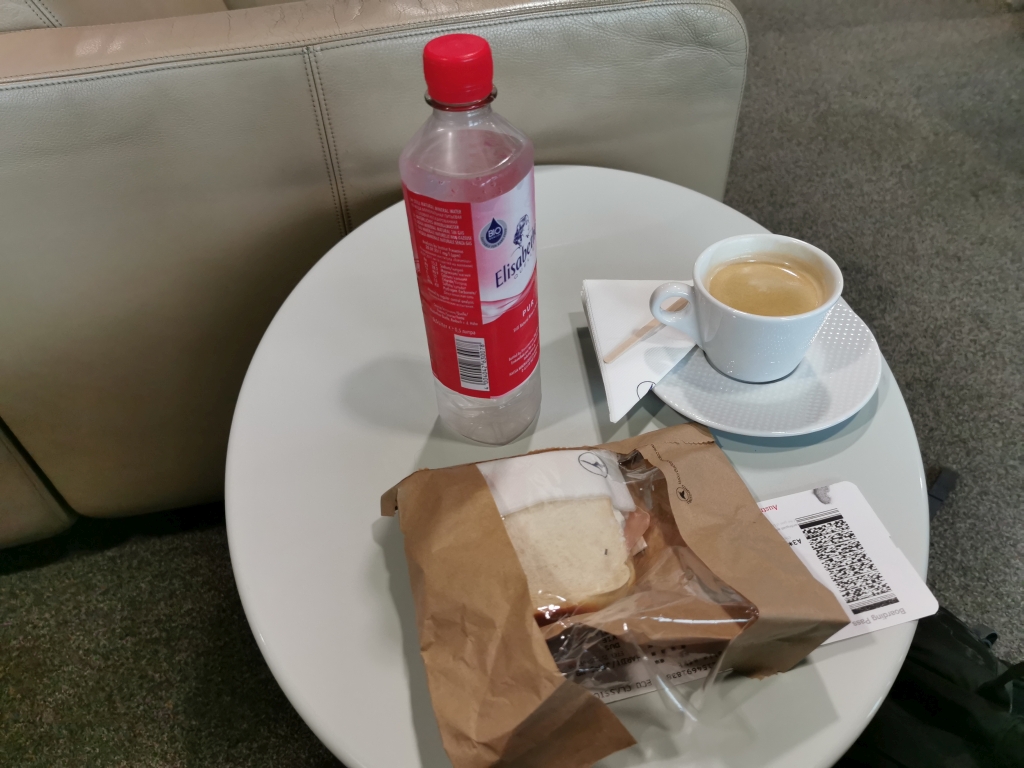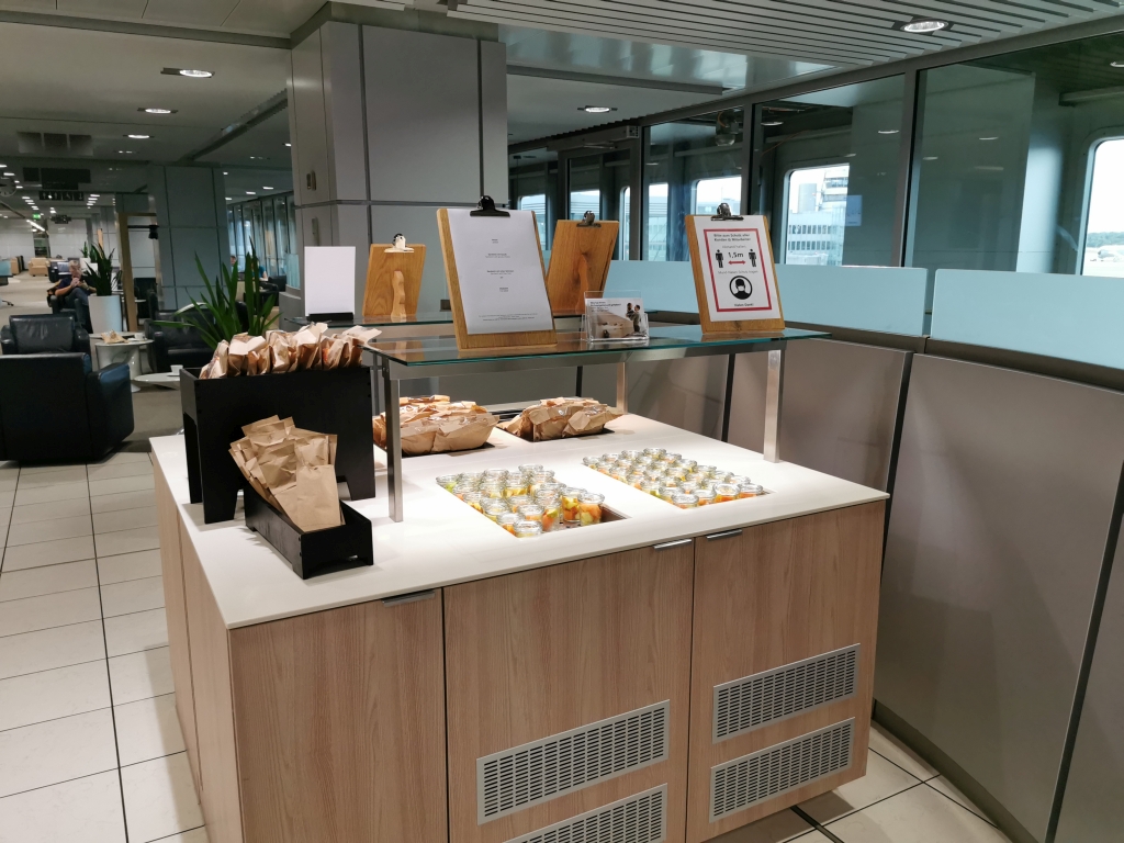 In der Lounge (auch recht leer) dann ein etwas anderes Bild. Das Essen ist alles abgepackt und die Getränke bekommt man von einer netten Dame zubereitet. Mehrfachbenutzung von Gläsern oder Tassen ist nicht erlaubt (Jens wollte eine zweite Tasse Kaffee haben und bekam ein neues Set) und es wurde peinlich genau auf die Hygiene geachtet.
