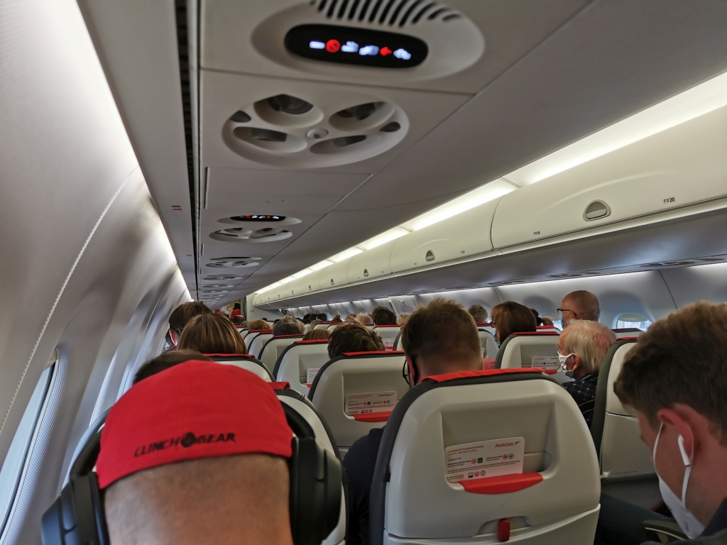 Im Flugzeug dann aber wieder: Alle brav auf ihren Plätzen und mit Maske.