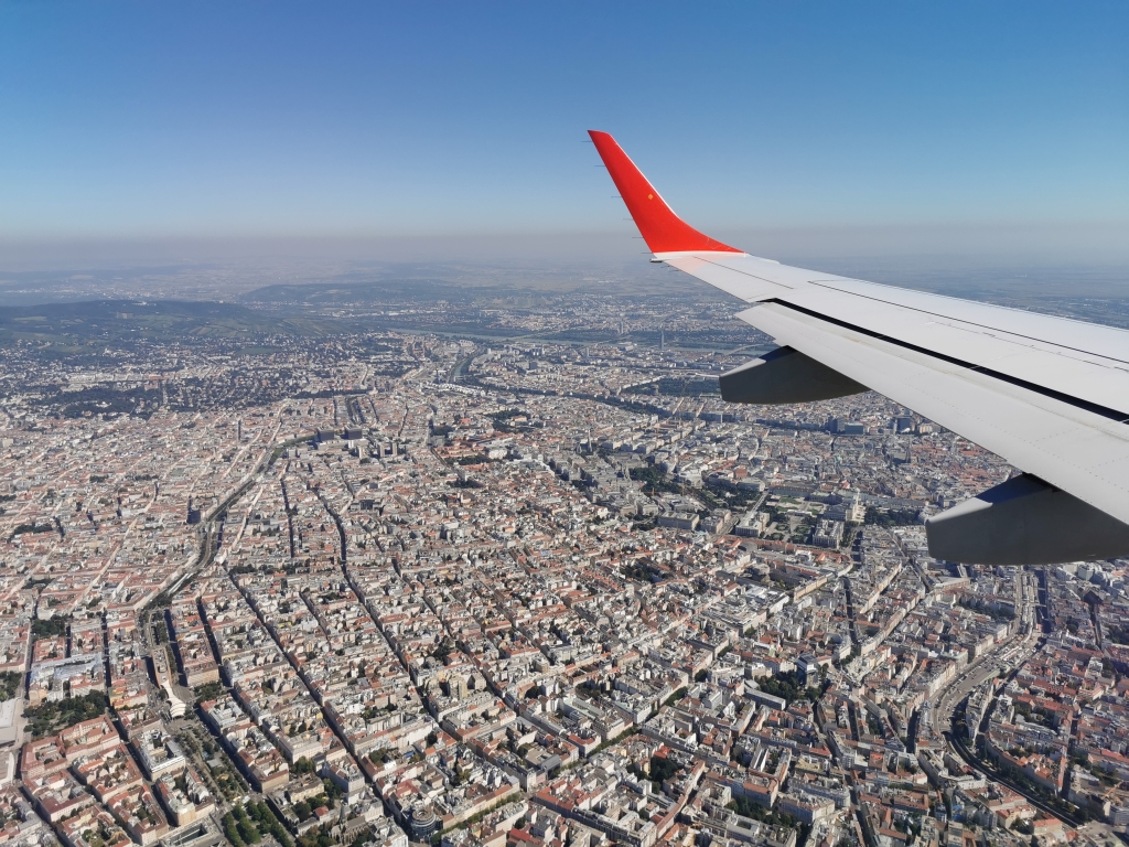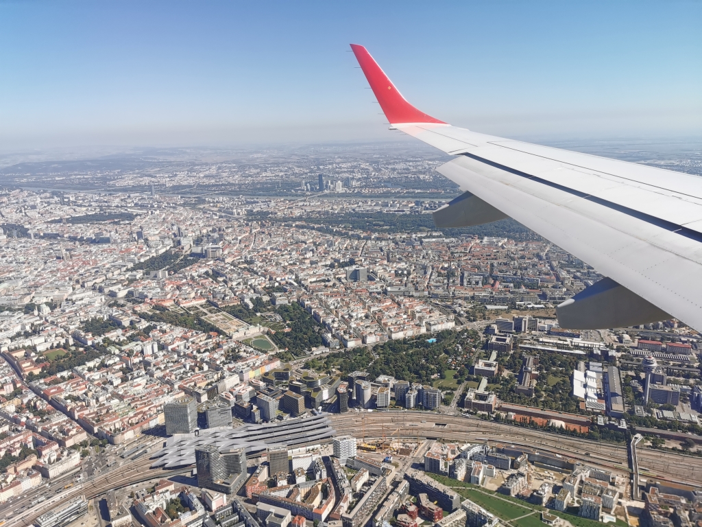 Die 1:10 Stunden Flug gingen dank vorher auf das Handy geladenen Videos („All Or Nothing“ bei Jens) bzw. Musik (Bläck Föös bei Meike) sehr schnell um. Und in Wien bekamen wir dann, quasi als Willkommensgeschenk, einen Überflug über die Innenstadt – ein ungewöhnlicher Anflug und ein wunderbarer Ausblick, gerade bei dem blauen Himmel.