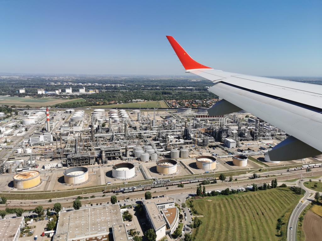 Und beim direkten Anflug auf Schwechat der Chemiepark direkt neben dem Flughafen.