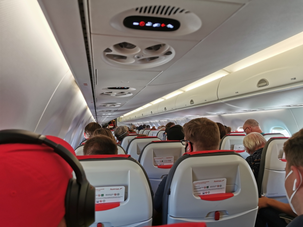 Und das Flugzeug war voll – maximal 4-5 freie Plätze haben wir gesehen. Von der Masken-Disziplin waren wir schon überrascht!