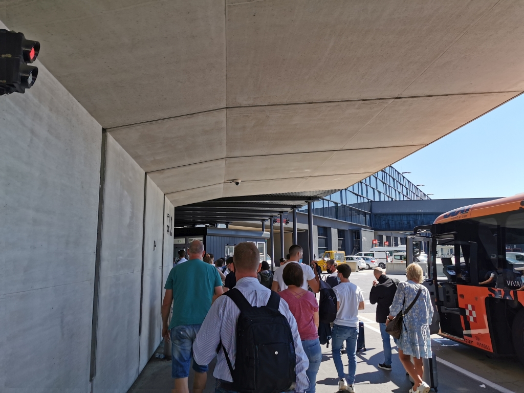 Zum Thema „Abstand halten“: Warum man dann, nachdem so penibel darauf geachtet wurde, alle in 2 Busse zwängt und am Terminal alle durch einen recht engen Gang führt, ist uns nicht besonders klar.