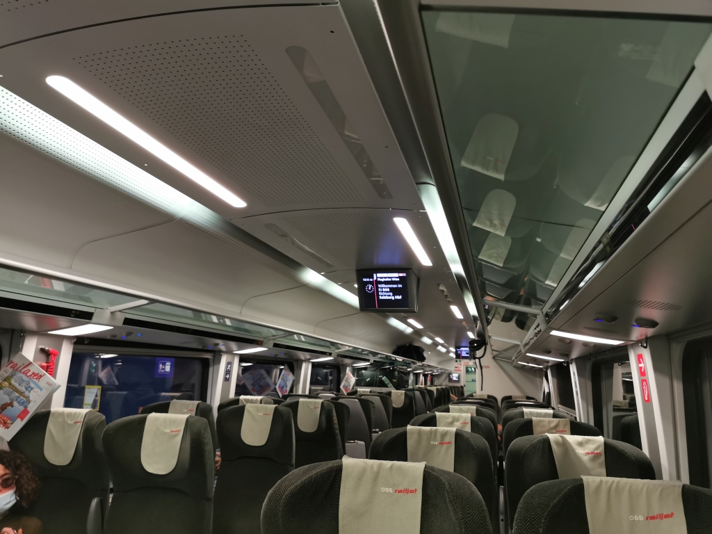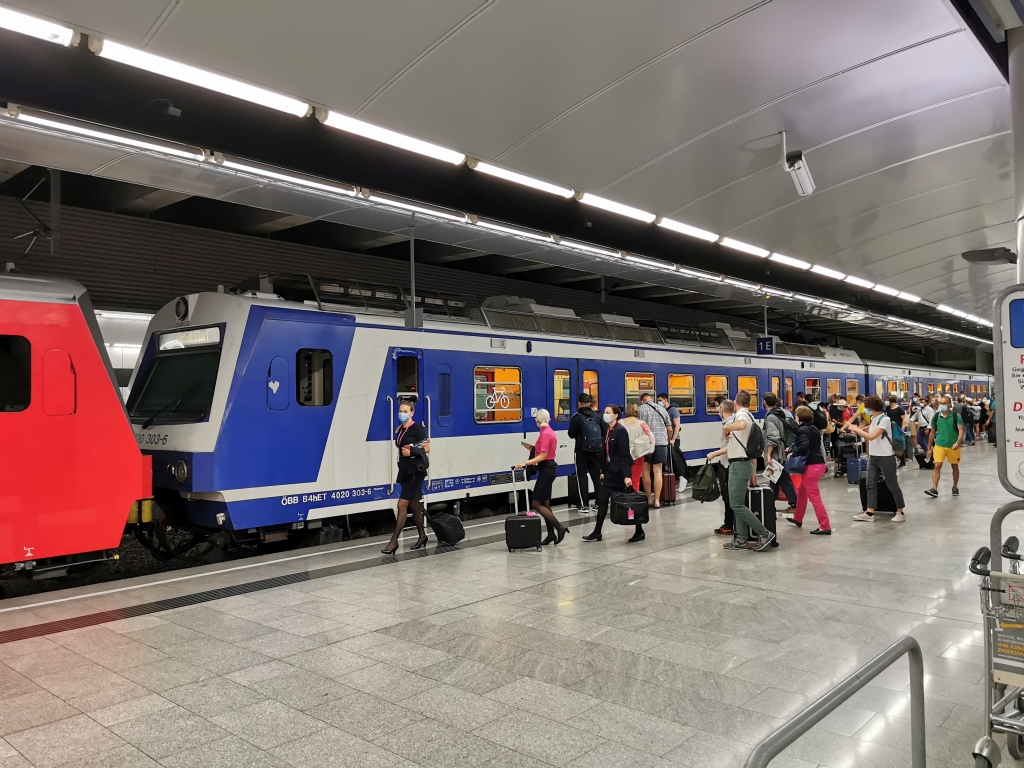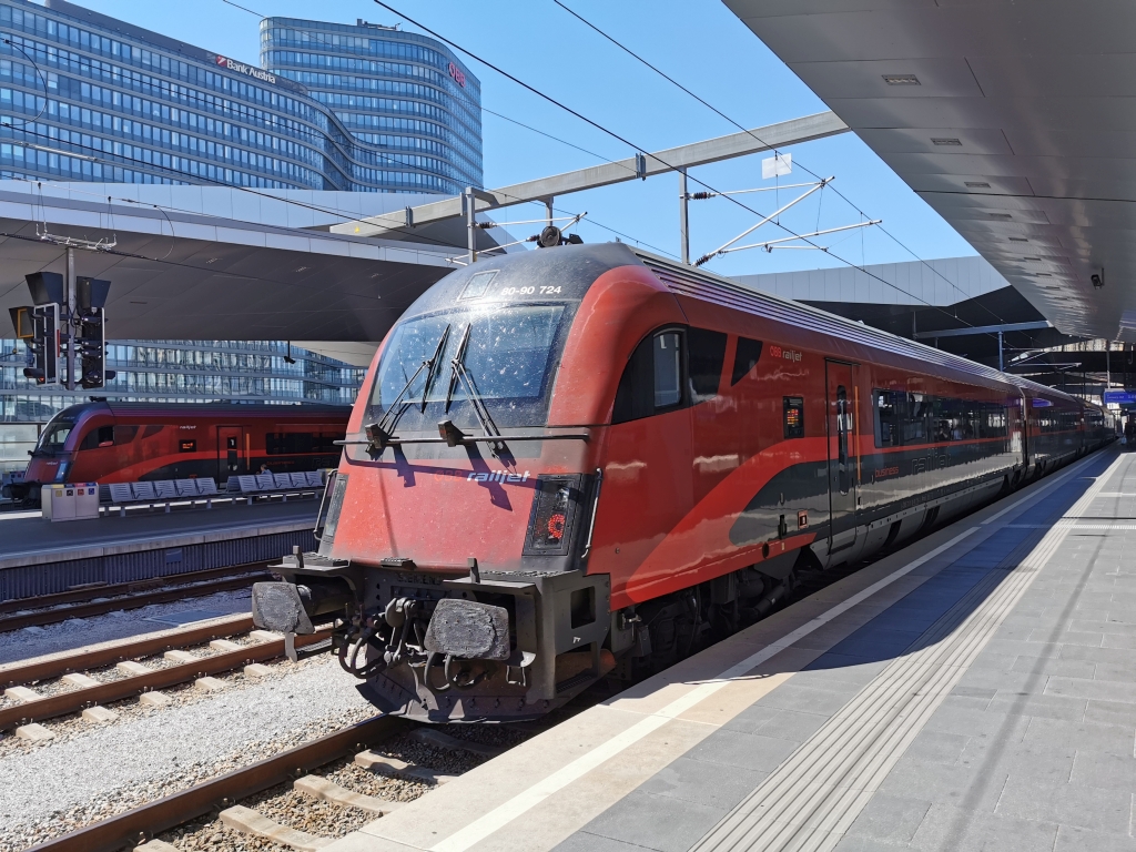 Und: Vom Flughafen zum Hauptbahnhof kann man für den gleichen Preis wie mit der S-Bahn (4,20 Euro) mit dem Railjet fahren, der österreichischen Variante unseres InterCity. Und im Railjet ist immer viel Platz für uns.