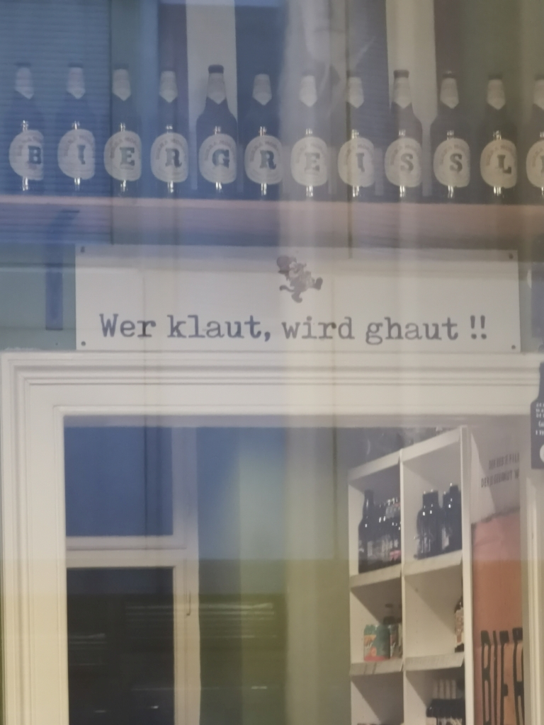 Auf dem Weg lag eine Bierhandlung, das Biergreissler. Mit einer kurzen und einfach formulierten Einstellung dem Ladendiebstahl gegenüber.